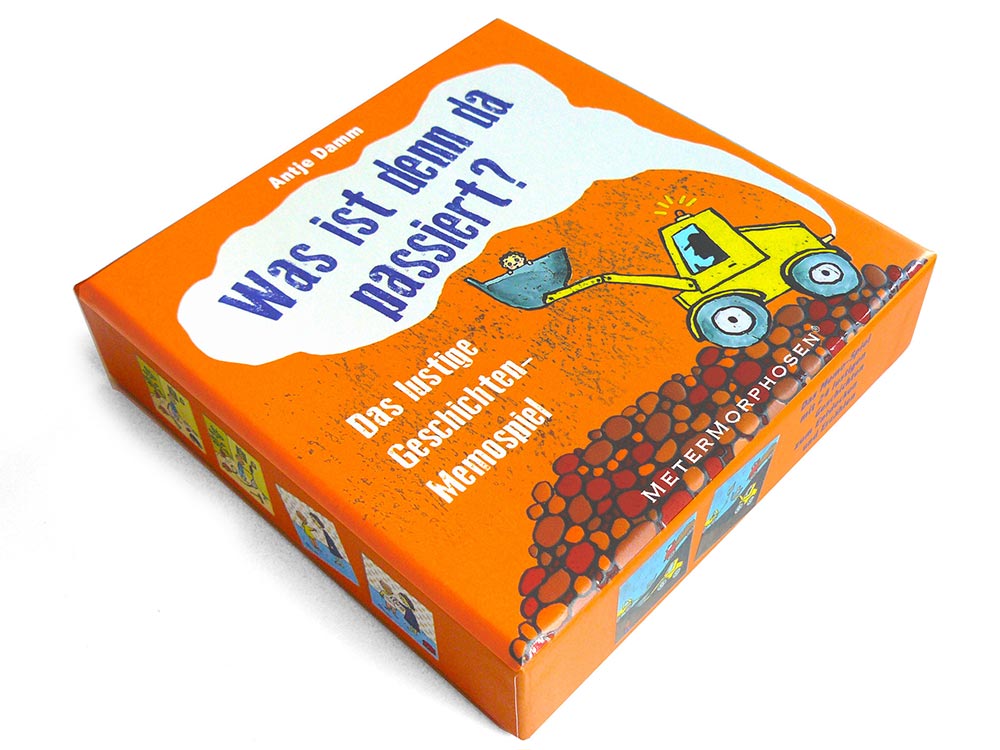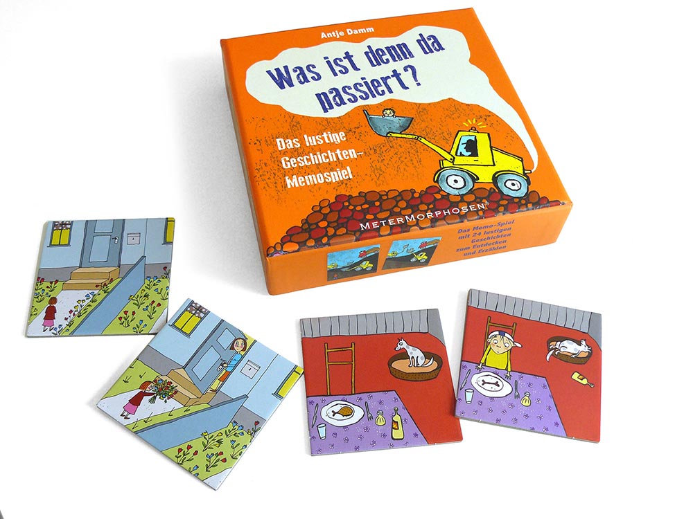 Was ist passiert, wenn Spaghetti auf dem Kopf und eine Katze im Staubsauger gelandet sind? Wer ein passendes Paar beim Memospiel findet, darf die kleine Geschichte erzählen, die er entdeckt hat. Es gilt nicht nur, die ungleichen Paare zu finden, sondern auch zu assoziieren, die Bilder zuzuordnen und ihre Geschichten zu entdecken. Eine tolle Gelegenheit fürs Fantasieren, Lachen und Miteinandersprechen! Die 48 Karten visualisieren bei diesem Suchspiel kleine Geschichten, die die Spieler erzählen sollen, wenn sie ein Paar gefunden haben. Ein Memospiel mit ungleichen Motiven für genaue Beobachter: Was hat sich beim zweiten Bild verändert?
