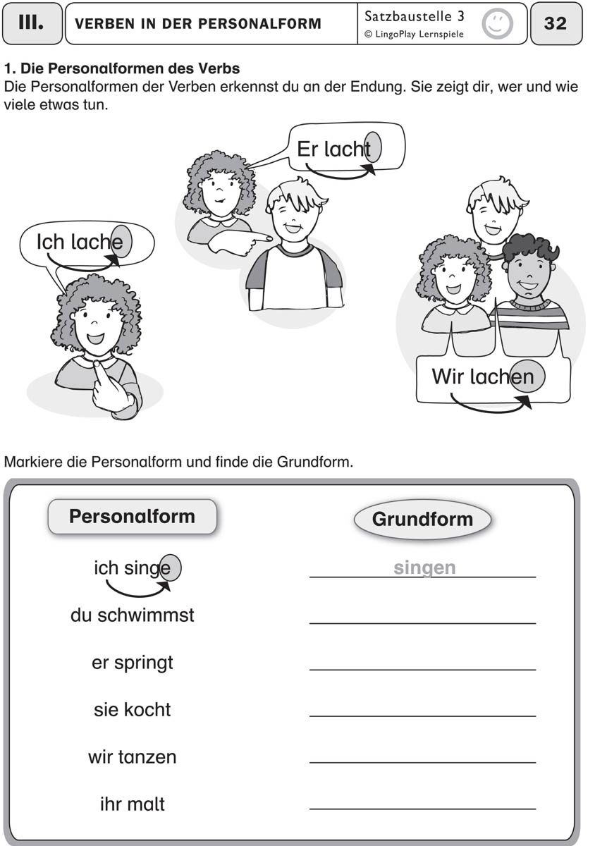 Diese Satzbaustelle 3 bietet einen großen Fundus an kindgerechten Aufgaben rund um das wichtige Thema "Verben". Die Schüler untersuchen die Wortart Verb und lernen verschiedene Verbtypen kennen: regelmäßige, unregelmäßige, trennbare, reflexive und modal gebrauchte Verben. Durch abwechslungsreiche Konjugationsübungen lernen die Schüler, die Personalformen normgerecht zu gebrauchen und die Zeitformen Präsens, Präteritum und Perfekt richtig zu bilden. Darüber hinaus untersuchen die Schüler die Stellung des Verbs in Aussage- und Fragesätzen. Ab der 2. Klasse.