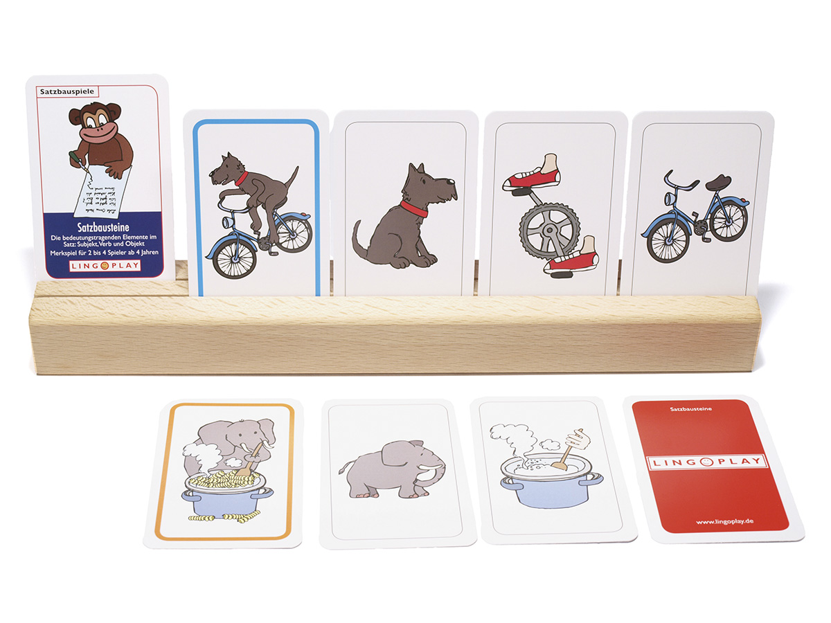 Satzbausteine: Ziel des Spiels ist es, zu den Handlungskarten passende Satzbausteine zu finden: Figur, Tätigkeit und Objekt. So gehören zur Abbildung »Der Hund fährt Fahrrad« die drei Karten »Hund«, »fahren« und »Fahrrad«. Die Spieler decken abwechselnd drei Karten auf und beschreiben die darauf abgebildeten Motive. Passen sie zu einer der offen liegenden Handlungskarten, darf der Spieler die Karten behalten. Sind alle Kartentrios gefunden, ist das Spiel beendet und der Spieler mit den meisten Karten hat gewonnen.