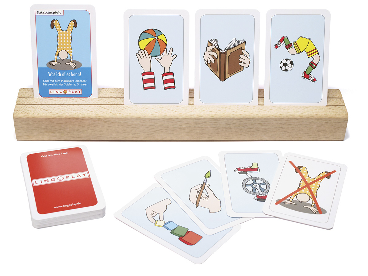Was ich alles kann! Bei diesem Spiel ziehen die Spieler abwechselnd so viele Karten vom Kartenstapel, wie sie möchten. Dabei beschreiben sie die dargestellte Tätigkeit mit dem Modalverb können, wie im Beispiel »Ich kann schwimmen«. Aber aufgepasst! Jeder Zug birgt die Gefahr, eine Risiko-Karte zu ziehen. Hat ein Spieler eine solche Karte aufgedeckt, muss er alle Karten abgeben, die er in dieser Runde gezogen hat. Die auf der Risiko-Karte dargestellte Tätigkeit wird verneint, zum Beispiel »Ich kann nicht nähen«. Das Spiel ist beendet, wenn alle Karten vom Stapel gezogen sind. Der Spieler mit den meisten Karten hat gewonnen.