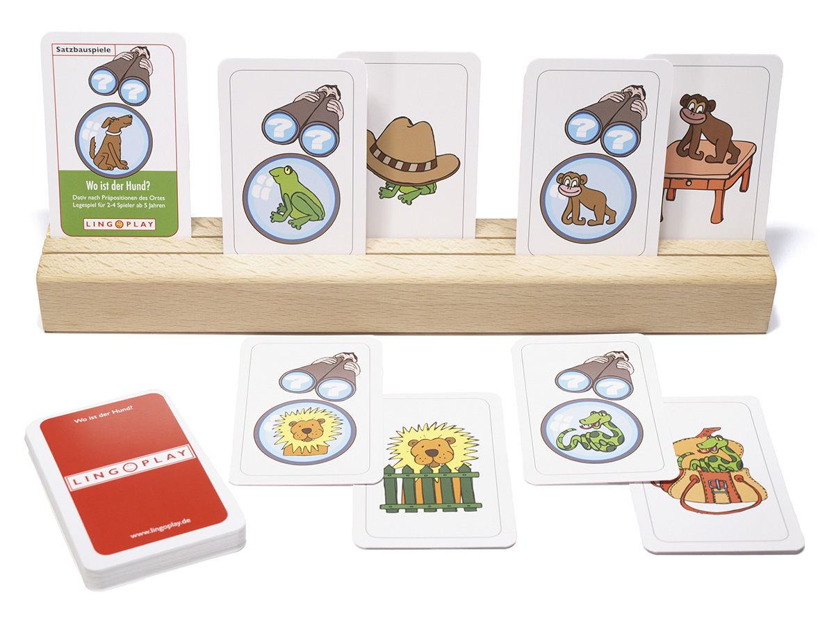 Beim Spiel Wo ist der Hund? geht es darum, die eigenen Karten mit den passenden Fragekarten abzudecken. Dazu drehen die Spieler eine der verdeckt liegenden Karten um und formulieren Fragen wie »Wo ist der Hund?« Dann suchen sie unter den offen liegenden Karten die passende heraus und antworten: »Der Hund ist unter dem Sonnenschirm.« Sind alle Karten eines Spielers abgedeckt, hat dieser gewonnen und das Spiel ist beendet.