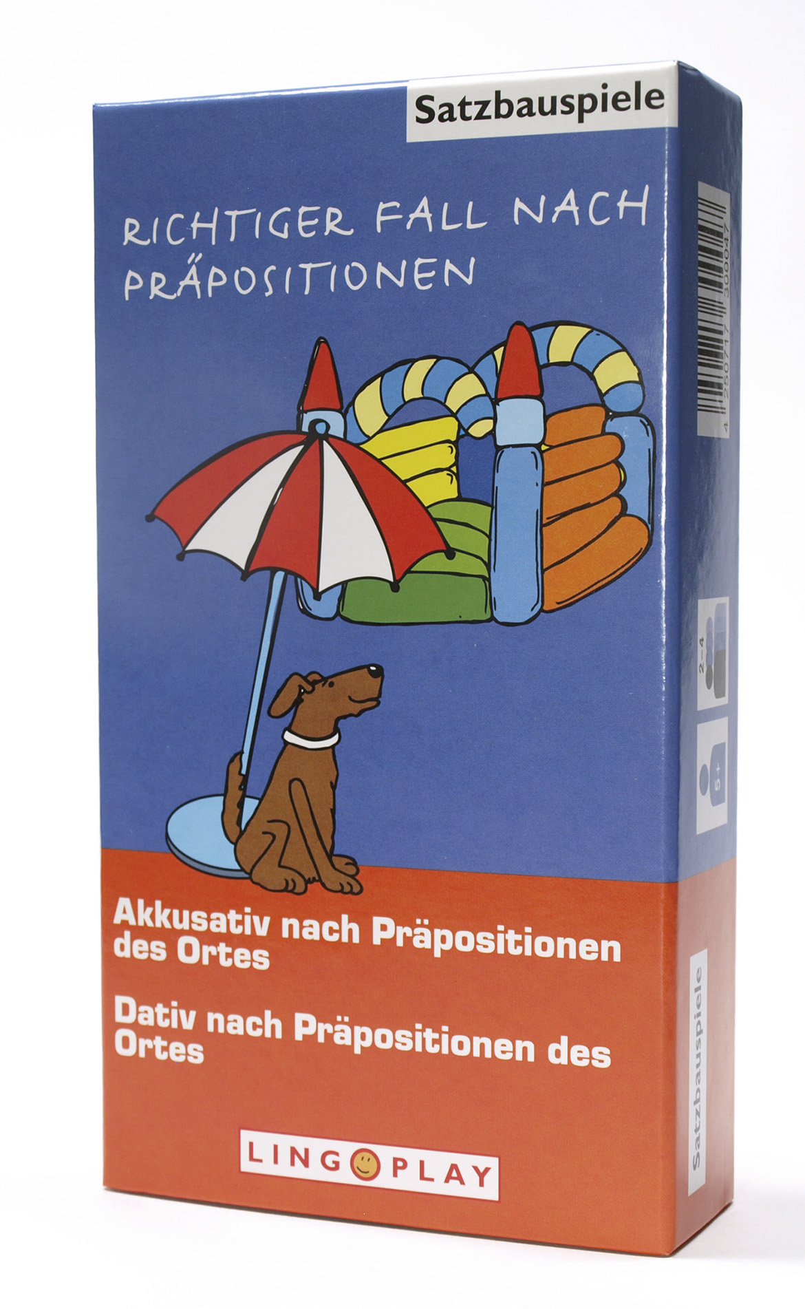 Zwei Spiele in einer Box: Diese beiden Satzbauspiele helfen, den richtigen Fall nach Präpositionen des Ortes zu gebrauchen. Bei einigen Präpositionen des Ortes können sowohl Akkusativ als auch Dativ stehen. Der Akkusativ nennt die Richtung auf ein Ziel, der Dativ gibt den aktuellen Ort an. Zum Beispiel: »Wohin geht er? - Er geht in die Stadt.« (Akkusativ) »Wo wohnt er? - Er wohnt in der Stadt.« (Dativ) Die Präpositionen, bei denen entweder Dativ oder Akkusativ stehen kann, sind: auf, unter, hinter, vor, in, über, neben, an, zwischen.