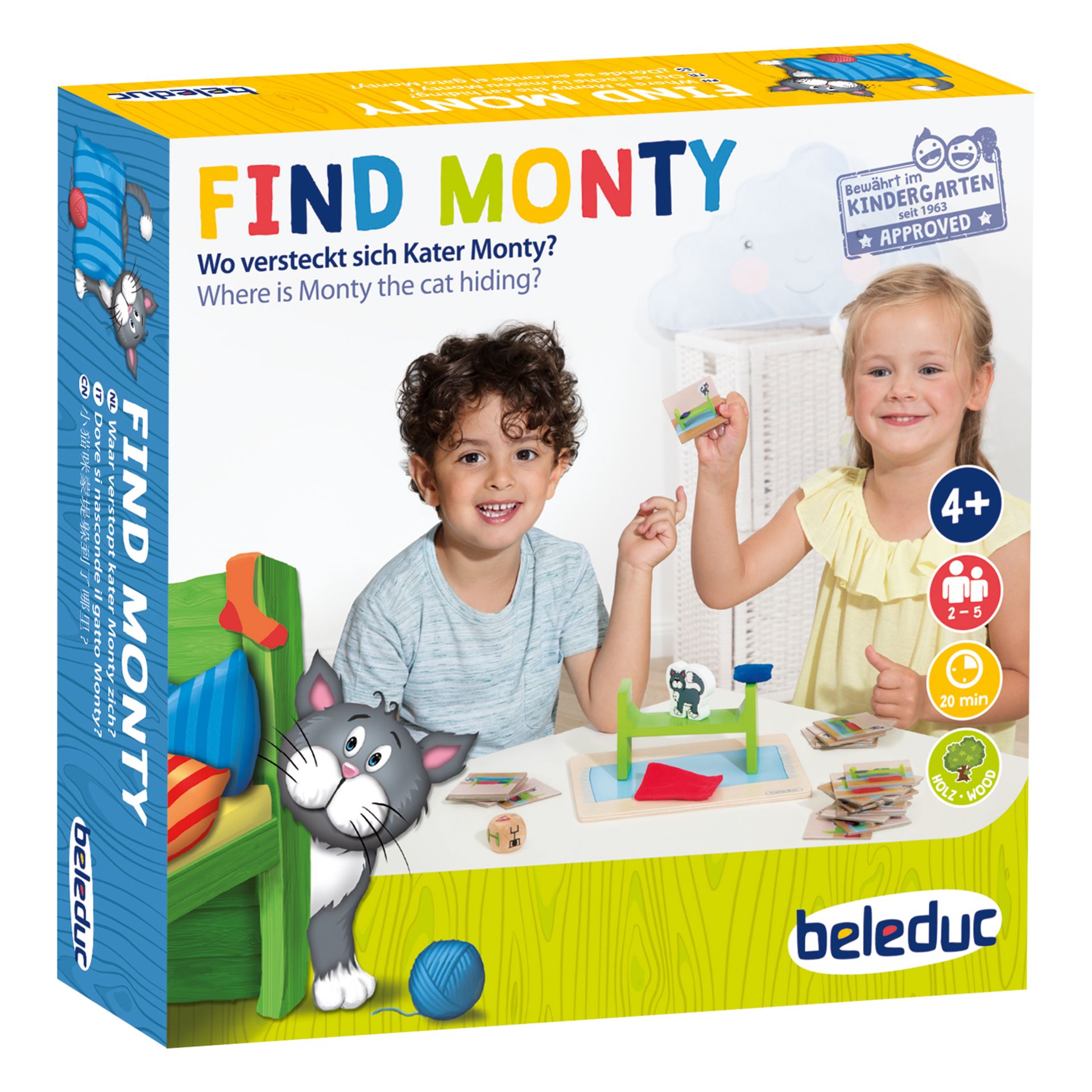 Wo ist die Katz´? Hier werden neben der Merkfähigkeit und räumlichen Wahrnehmung auch die Fähigkeit zur sprachlichen Beschreibung und die Grammatik gefördert. Dazu zeigt der Würfel Symbole für "Nachbauen", "Über Kopf" und ""Beschreiben".