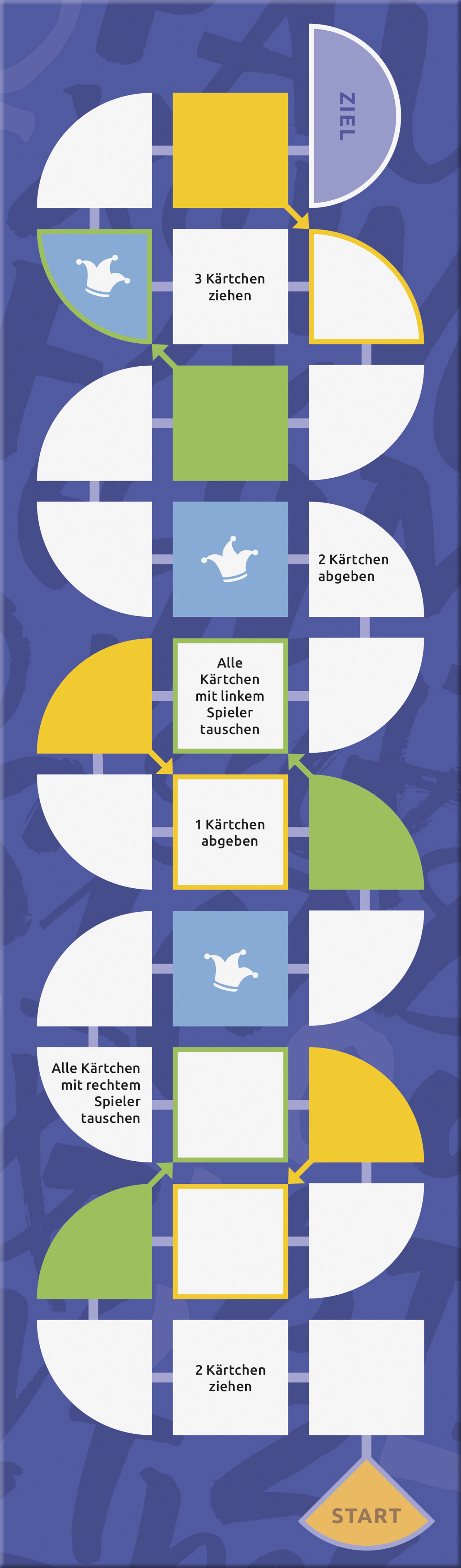80 beidseitig bedruckten Wortkärtchen, Spielplan, 2 Würfel. 4 Spielsteine