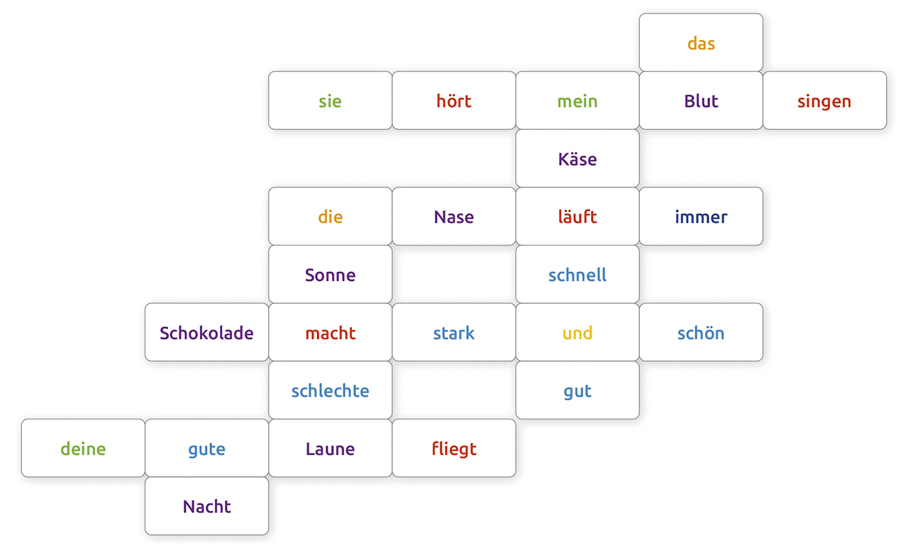 Ein Spiel für alle, die gern kreativ mit Sprache umgehen, indem Wörter in waagerechte oder senkrechte Reihen gelegt werden, um Sätze zu bilden. Inhaltlich kann das völliger Unsinn sein, aber grammatikalisch muss es stimmen, um Spielfelder vorrücken zu können.