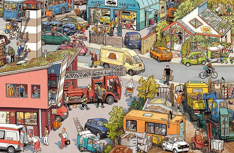 Die Feuerwehrfrau Aynur zum Beispiel, die immer für den Ernstfall gerüstet ist. Oder der Briefträger Josef, dessen Kinder auf Fahrrädern und Rollern die Briefe verteilen helfen, weil das Postauto einen Platten hat. Die Wimmelbilder vermitteln spannende Einblicke in den Berufsalltag dieser und vieler weiterer Frauen und Männer und zeigen, wer auf welche Weise für das Zusammenleben in der kleinen Stadt von Bedeutung ist.