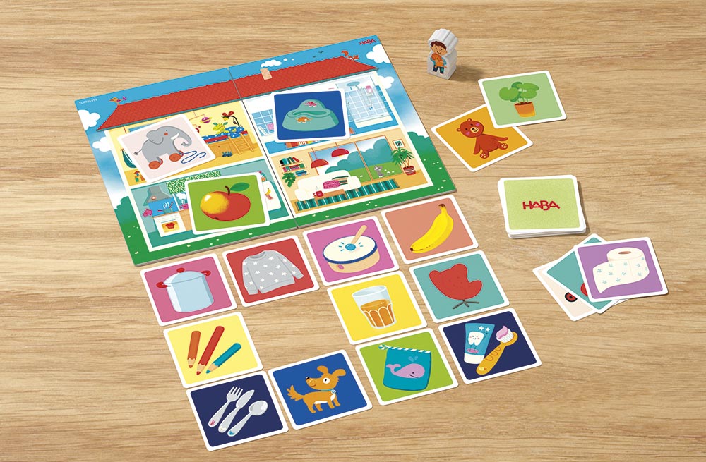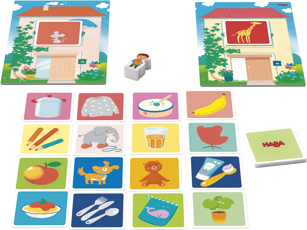 Mit diesem Spiel üben Kinder das Benennen und Zuordnen von alltäglichen Gegenständen mit liebevoll gestalteten Motiven aus dem Kinderalltag. Wo gehört der Teddy hin? 32 Gegenstände sind vier Räumen zuzuordnen: Wohnzimmer, Bad, Küche und Kinderzimmer. Im zweiten Spiel ordnen die Kinder Dinge und Tiere nach Kategorien: drinnen/draußen, Tag/Nacht, klein/groß, leicht/schwer. Das liebevoll gestaltete Spielmaterial besteht aus stabiler Pappe. Die doppelseitig bedruckte Holzfigur ist als Mädchen und als Junge gestaltet. Sie begleitet die Kinder beim Erkunden des Hauses und lädt zum freien Spielen ein. Ordnung macht riesen Spaß mit HABA! Meine ersten Spiele - Mein Zuhause ist eine farbenfrohe Spielesammlung mit zwei spannenden Zuordnungsspielen für Kinder ab 2 Jahren. Wohin mit dem Töpfchen? 32 Gegenstände sind vier Räumen zuzuordnen: Wohnzimmer, Bad, Küche und Kinderzimmer. Im zweiten Spiel ordnen die Kinder Dinge und Tiere nach Kategorien: drinnen/draußen, Tag/Nacht, klein/groß, leicht/schwer. Meine ersten Spiele von HABA vermitteln Kindern ab 2 Jahren altersgerecht das Spielen nach Regeln.