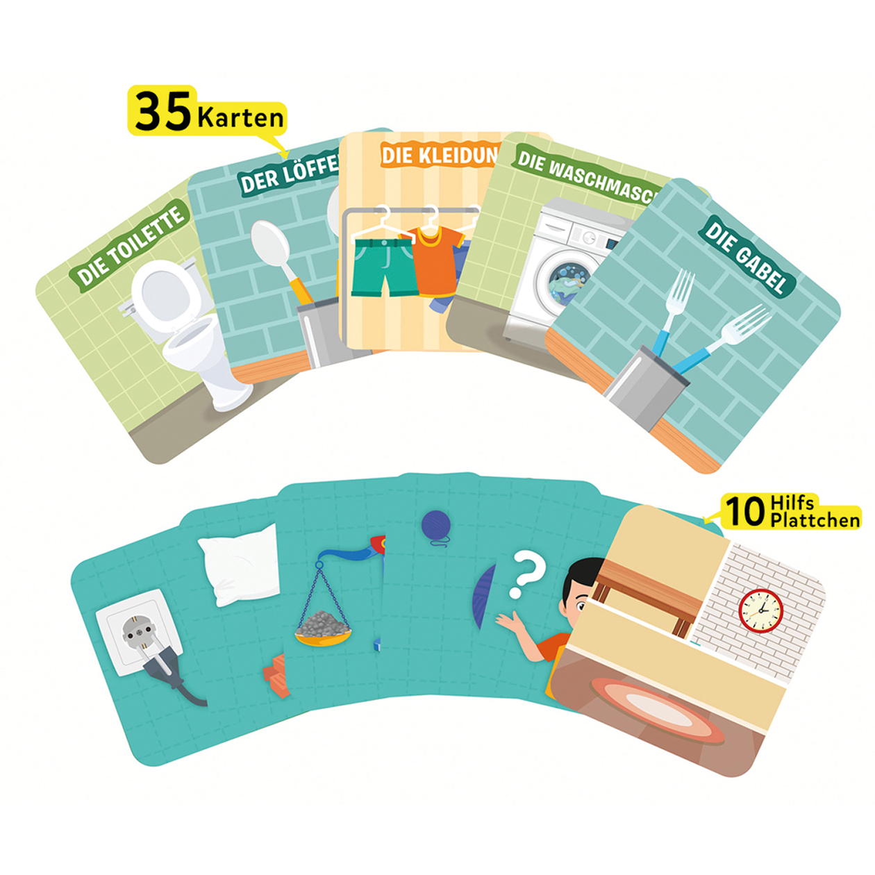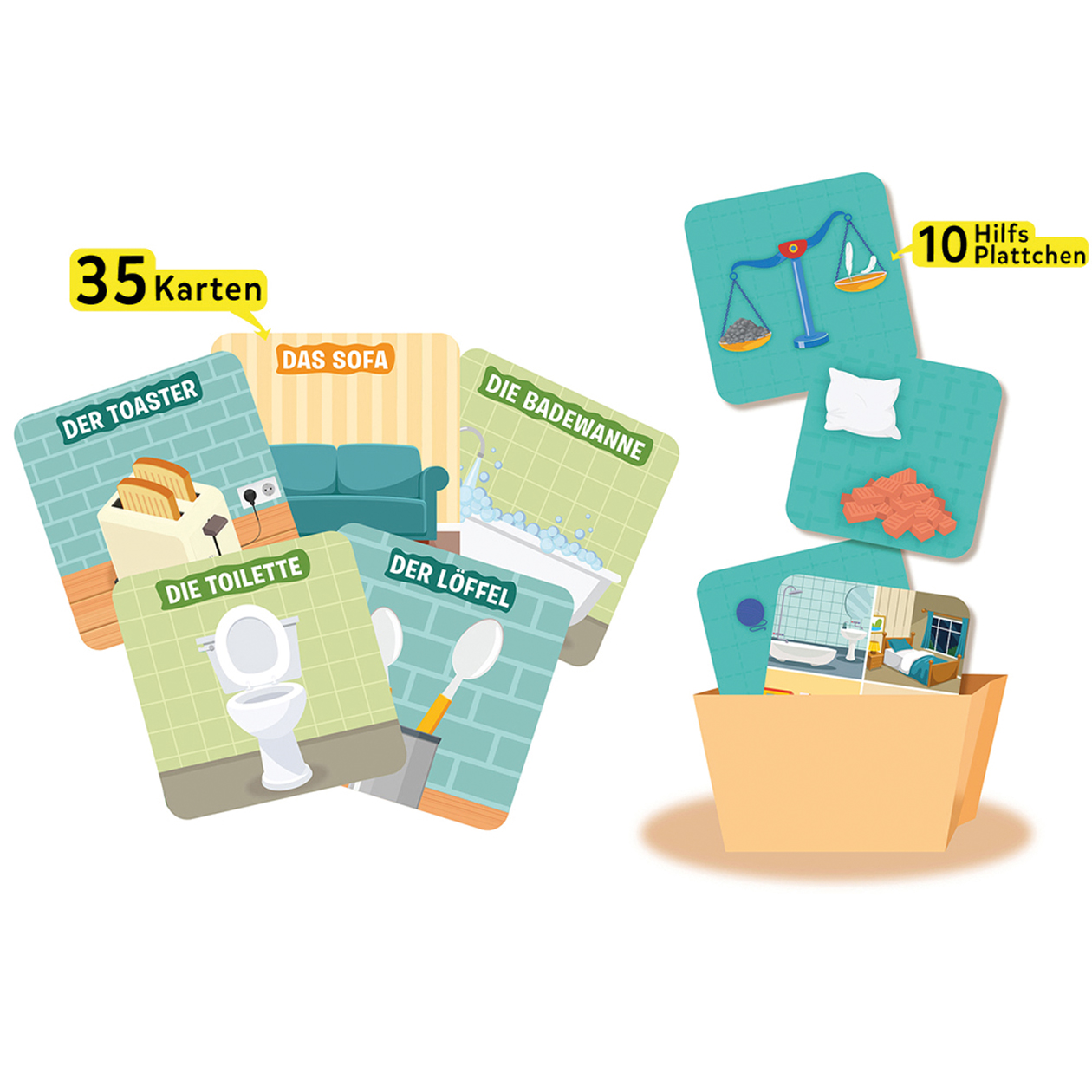 35 Karten, 10 Hilfsplättchen, Anleitung, Kartenbox