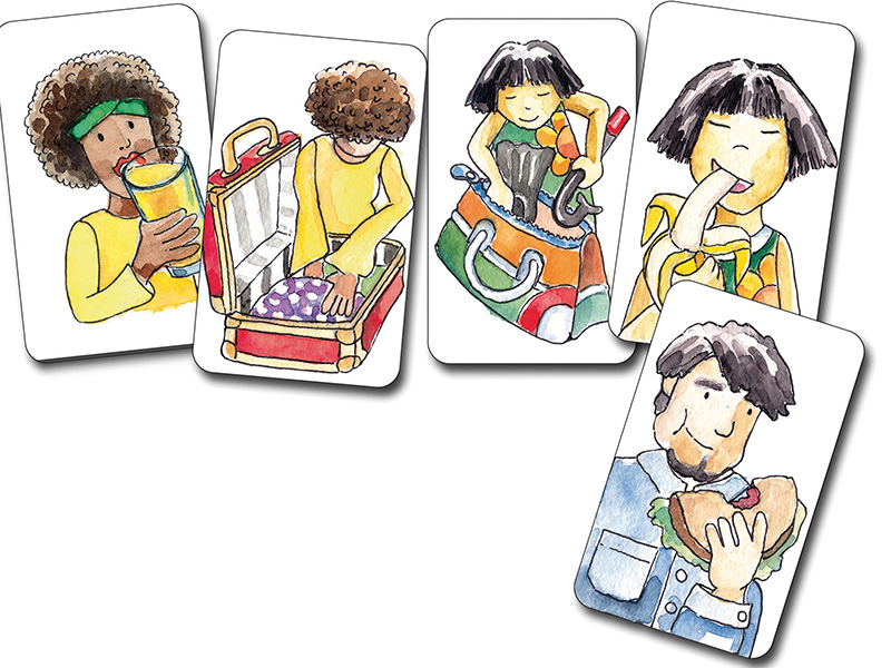 Ein Ablegespiel mit 8 hochfrequenten Verben nach dem Mau-Mau-Prinzip: Eine Karte wird abgelegt, wenn sie entweder dieselbe Figur bei einer anderen Tätigkeit oder eine andere Figur bei derselben Tätigkeit zeigt.