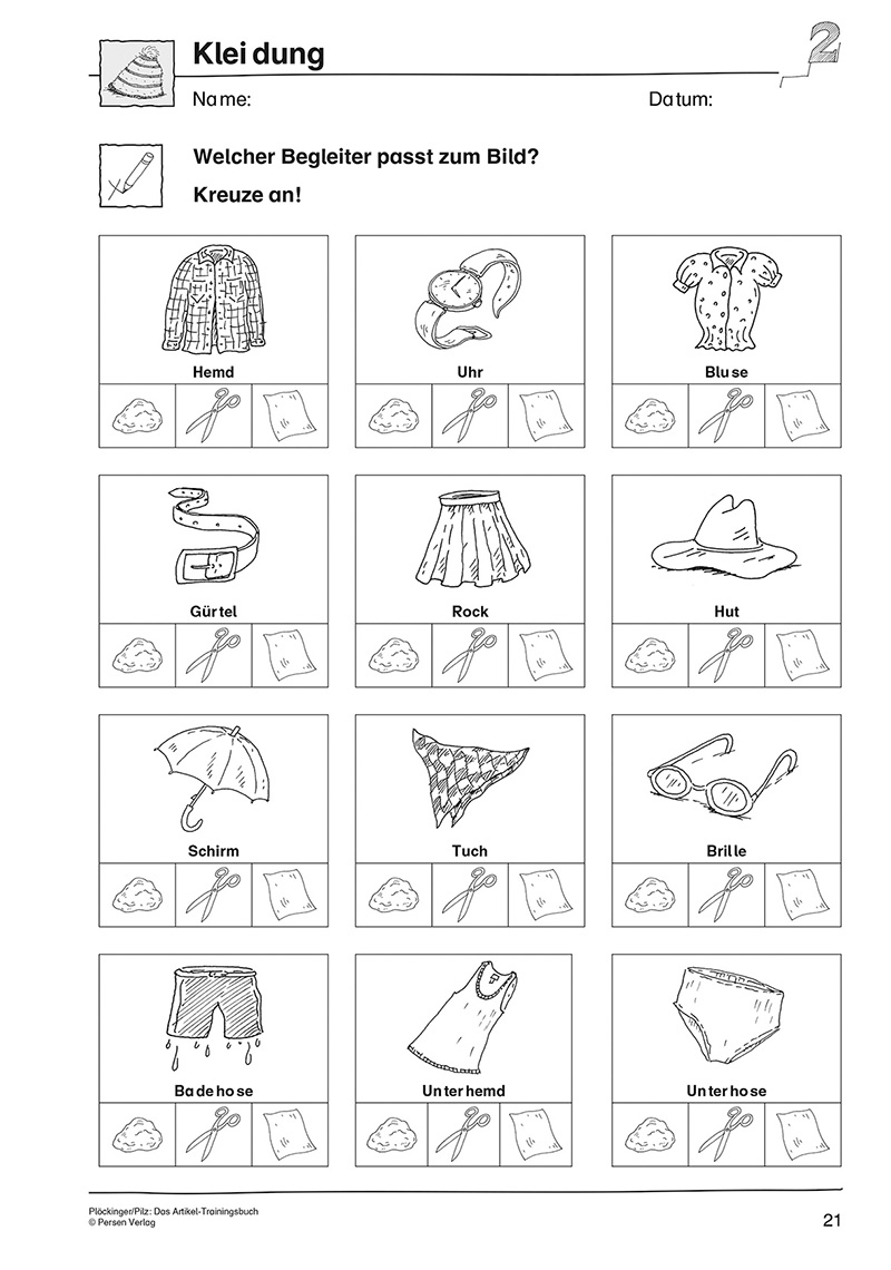Einfache Übungsblätter zu bestimmten und unbestimmten Artikeln. Der, die oder das? Die Wahl des richtigen Artikels fällt vielen Schülern mit sonderpädagogischem Förderbedarf sehr schwer, da die Zuordnung des Geschlechts in der deutschen Sprache nicht regelgeleitet ist. Dieses Buch bietet umfangreiches und schematisch aufgebautes Übungsmaterial zum Thema in zwei Differenzierungsstufen. Das angebotene Wort- und Bildmaterial bezieht sich auf die schülernahen Themenfelder "Schule, Spielsachen, Kleidung und Körper". Durch den Einsatz von Handzeichen und Symbolen, die sich an dem bekannten Knobelspiel "Schere, Stein, Papier" orientieren, soll den Kindern das Lernen des richtigen Begleiters erleichtert werden.