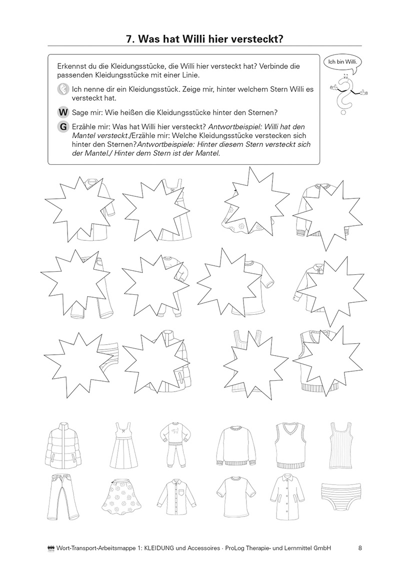 Nicht nur mit dem Wort-Transport-Spiel, sondern auch mit dieser anschaulich und gut strukturierten Mappe werden die Inhalte des Spiels vertiefend angeboten. Begleitet von Willi und Otto werden im Rahmen abwechslungsreicher Spielideen expressive und rezeptive Wortschatz- und Grammatikübungen rund um Nomen, Pluralformen, Präpositionen, Verben und Adjektive angeboten und um Übungen zur Anwendung von Satzstrukturen erweitert. Dabei werden auch Präpositionalphrasen, Pluralformen, Kasusbildungen, Possessivstrukturen, Artikel, Adjektive und Perfektbildung einbezogen.