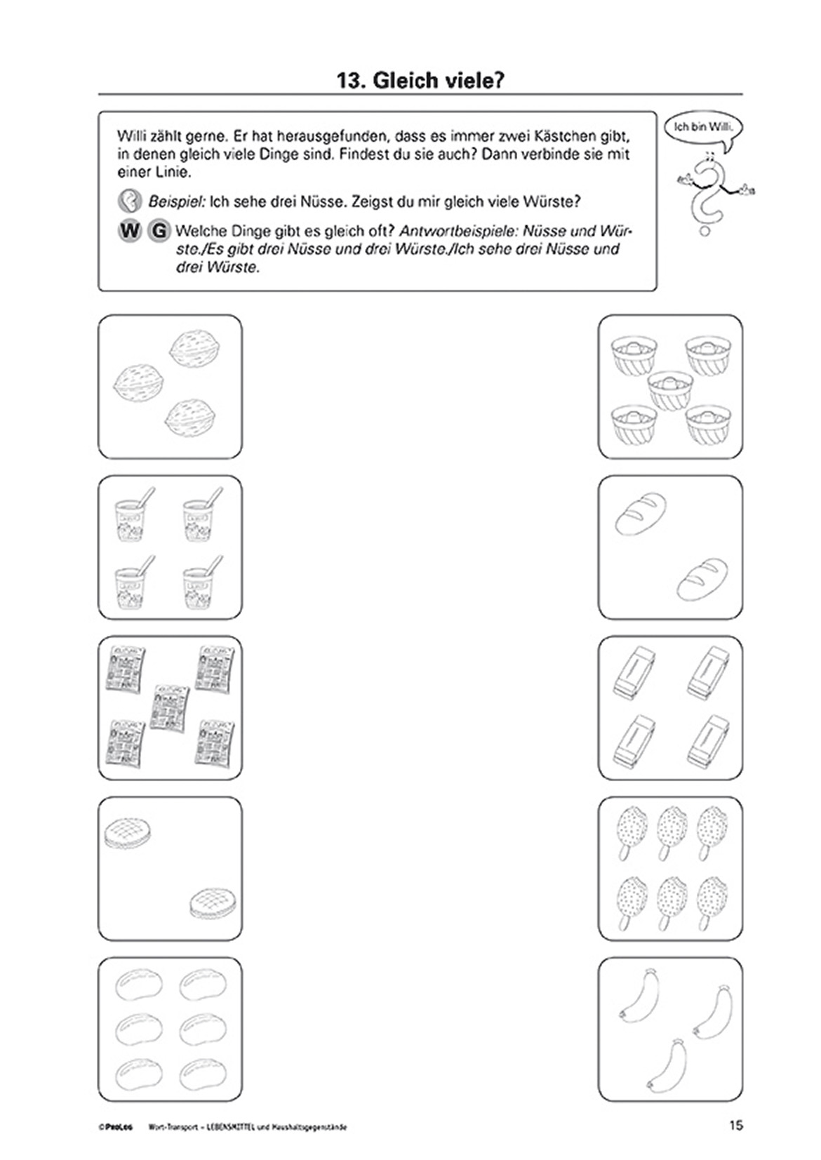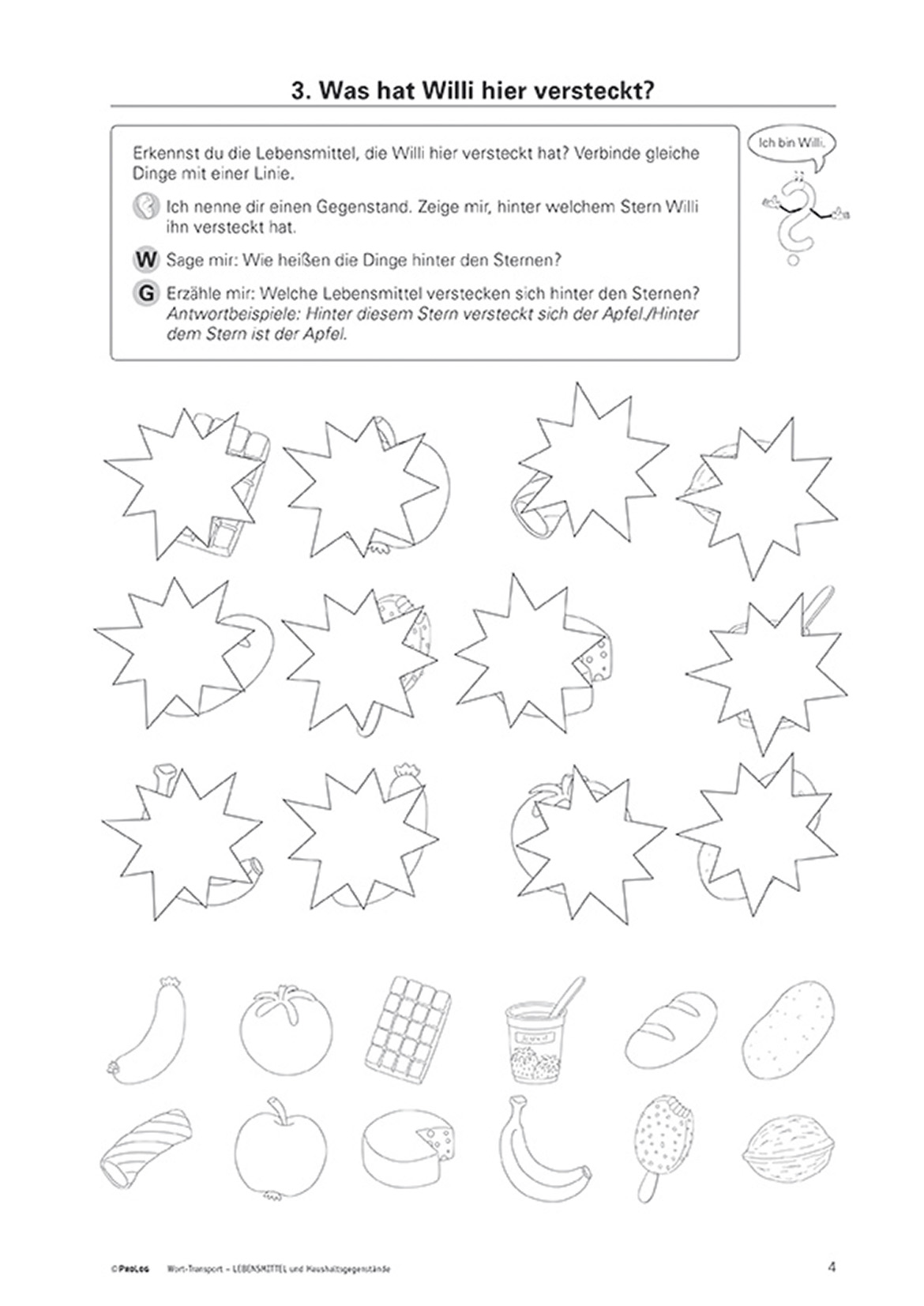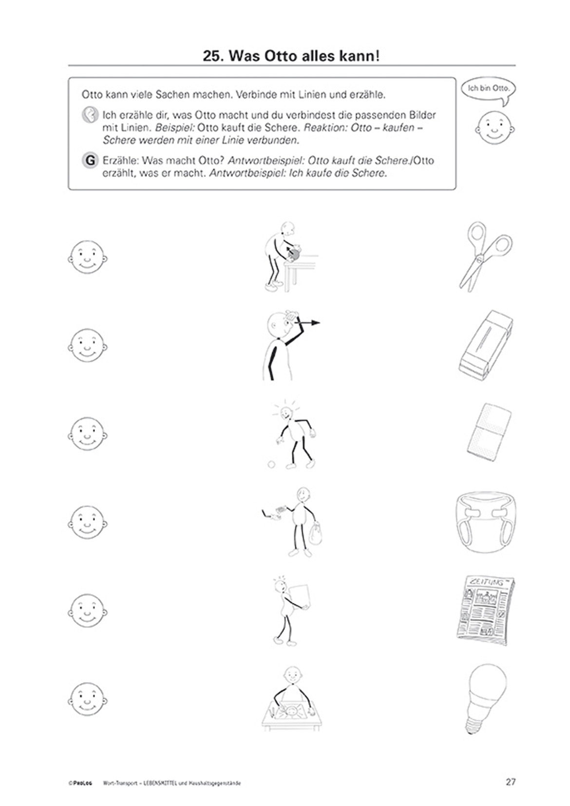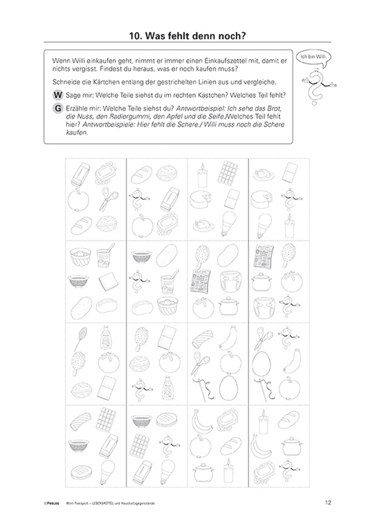 Nicht nur mit dem Wort-Transport-Spiel, sondern auch mit dieser anschaulich und gut strukturierten Mappe werden die Inhalte des Spiels vertiefend angeboten. Begleitet von Willi und Otto werden im Rahmen abwechslungsreicher Spielideen expressive und rezeptive Wortschatz- und Grammatikübungen rund um Nomen, Pluralformen, Präpositionen, Verben und Adjektive angeboten und um Übungen zur Anwendung von Satzstrukturen erweitert. Dabei werden auch Präpositionalphrasen, Pluralformen, Kasusbildungen, Possessivstrukturen, Artikel, Adjektive und Perfektbildung einbezogen.