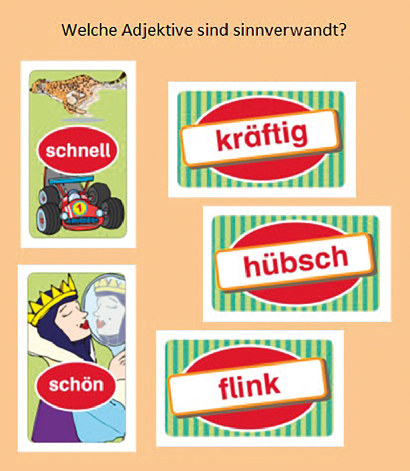 Mit diesem packenden Spiel lernen die Spieler sinnverwandte Wörter zu häufig gebrauchten Adjektiven, wie z. B. „schnell“, „kalt“, „groß“, „klein“ usw. kennen und erweitern so spielerisch ihren Wortschatz. Mit Selbstkontrolle!