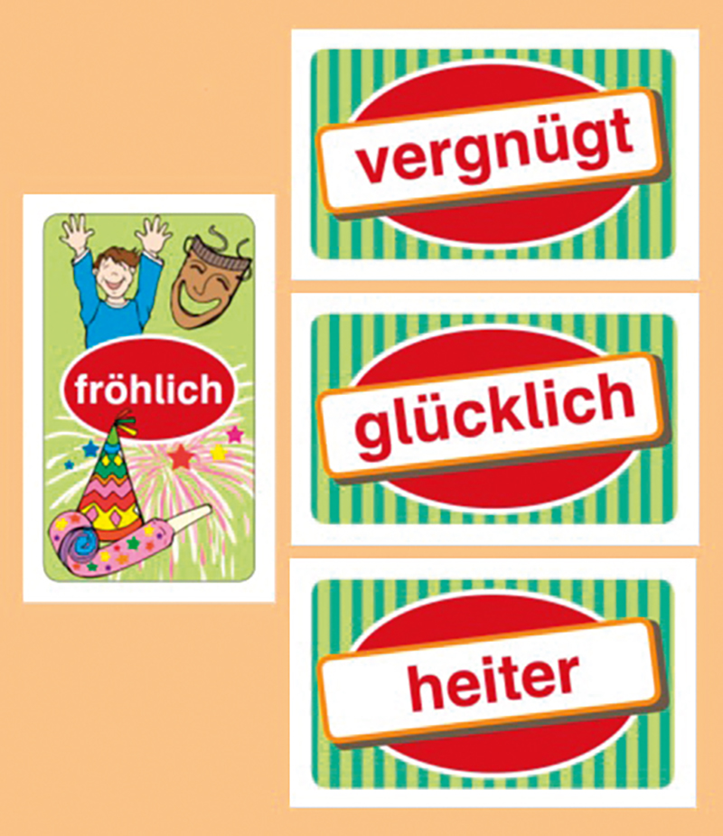 So wird gespielt: Der Spieler, der am Zug ist, zieht die oberste Wortkarte vom Stapel und wirft sie offen in den Kreis. Er liest das Wort und fragt dann nach einem sinnverwandten Adjektiv, wie z.B. „ein anderes Wort für betrübt ist?“ Wer als Erster die passende Bildkarte wie in diesem Fall „traurig“ findet und abklatscht, gewinnt die gezogene Wortkarte.