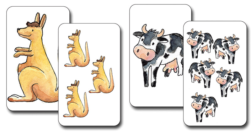 Ein Reaktionsspiel zur visuellen Wahrnehmung und Pluralbildung durch das Suchen von Kartenpaaren: Auf einer Karte ist ein Motiv einmal und auf einer weiteren Karte mehrmals dargestellt.