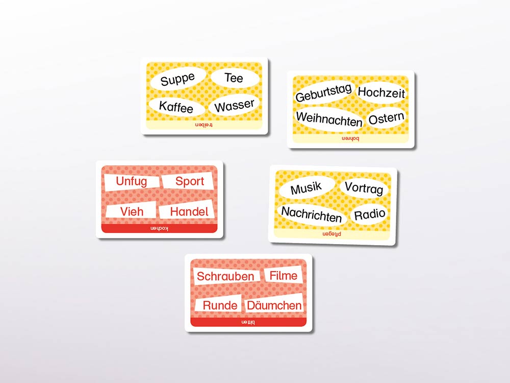 Geburtstag, Weihnachten, Hochzeit, Ostern - welches Verb passt zu allen vier Nomen? Richtig! Das Verb »feiern«. Hier geht es darum, Verben zu finden und zu benennen, die assoziativ und semantisch mit den vorgegebenen Nomen verwendet werden. In diesem Spiel werden vorhandene Netzwerke in unserem mentalen Lexikon aktiviert und neue generiert. Ein gutes assoziatives Netzwerk sichert die Wörter in unserem Gedächtnis und hilft uns, sie leichter zu finden und abzurufen. Mit Selbstkontrolle!