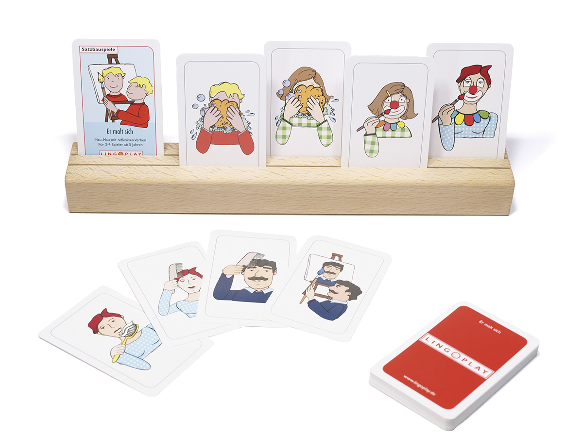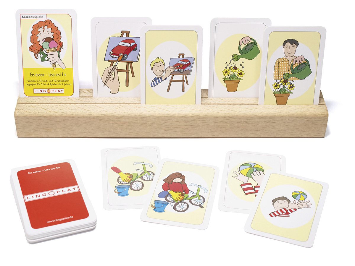 So vermittelt das Merkspiel "Eis Essen - Lisa isst Eis" anhand von 16 Minimalpaaren, wie sich Verben in der Grundform zur Personalform verändern, also flektiert werden, wenn ein Subjekt hinzukommt. Die eine Karte zeigt jeweils eine Tätigkeit an einem Objekt ohne Figur, wie z. B. Ball spielen oder Zeitung lesen, und die andere Karte zeigt eine Figur, die die Tätigkeit am Objekt ausübt, wie z. B. der Junge spielt Ball oder der Mann liest Zeitung. Der Spieler, der am Zug ist, dreht eine der verdeckt liegenden Karten um und beschreibt die darauf abgebildete Tätigkeit, wie z.B. "Eis essen". Dann sucht er die passende Figurenkarte unter den offen daliegenden Karten heraus, legt die gezogene an die gefundene Karte an und beschreibt wer die Tätigkeit ausübt, wie z.B. "Das Mädchen isst Eis!" Sind alle Karten eines Spielers abgedeckt, hat dieser gewonnen und das Spiel ist beendet.