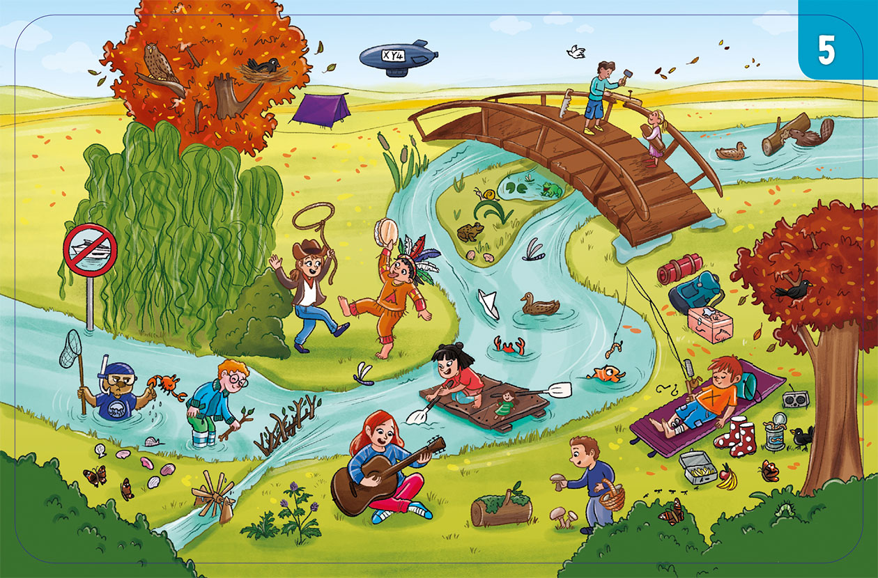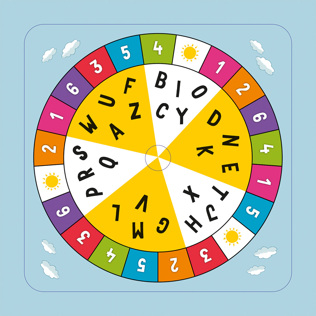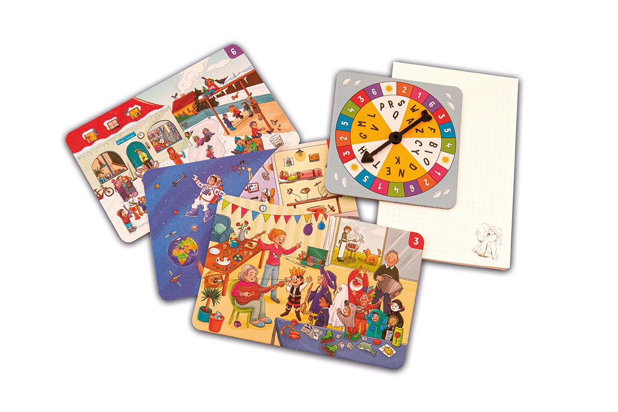 Spielerisch den Wortschatz erweitern. Die Drehscheibe gibt vor, welche der 6 Wimmelbildkarten gewählt wird: Unterwegs im Weltraum, in der Werkstatt, auf dem Kindergeburtstag oder Abenteuer erleben am Fluss, auf dem Spielplatz oder auf dem Schulhof.