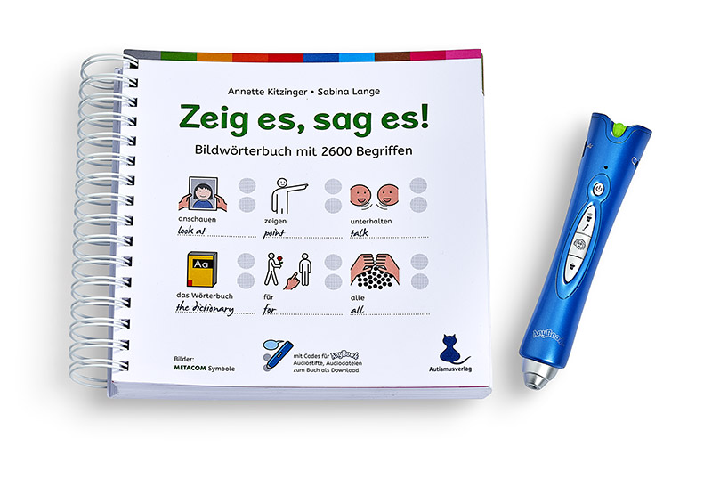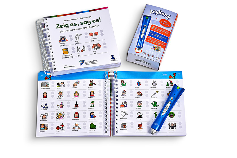 Das Set bestehend aus Bildwörterbuch mit eingedruckten Anybook PRO Audiocodes und Anybook PRO Audiostift (siehe auch Artikel-Nr. 262664) - komplett vertont!