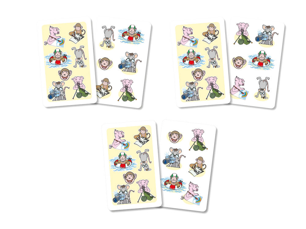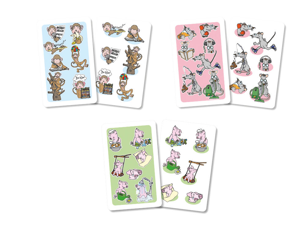 So wird gespielt: Die Spieler vergleichen zwei Bildkarten. Auf einer Karte fehlt jedoch ein Tier und es ist die Aufgabe der Spieler herauszufinden, welches. »Welches Schweinchen fehlt denn hier? Das Schweinchen, das duscht, oder das Schweinchen, das schaukelt?« Wer als Erster das fehlende Tier nennt, gewinnt die Karte.