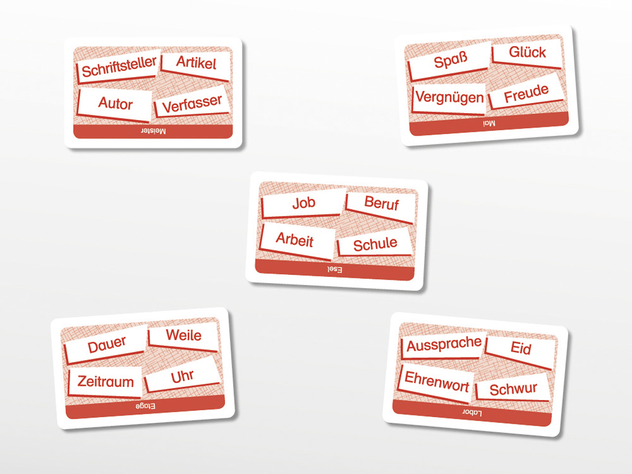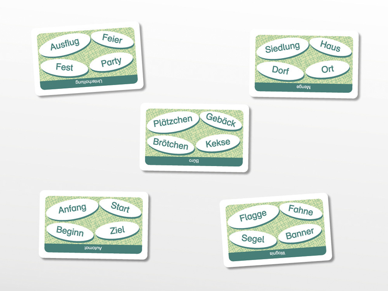 So wird gespielt: Ziel des Spiels ist es, herauszufinden, welches Wort nicht zur Gruppe gehört. Der Spieler, der am Zug ist, liest die Nomen laut vor, zum Beispiel „Anfang“, „Start“, „Beginn“ und „Ziel“. Nun raten die Spieler gemeinsam, welches Nomen nicht passt. In unserem Beispiel ist es „Ziel“, weil es nicht die Bedeutung „Ausgangspunkt, Ursprung“ hat. Wer als Erster das nicht passende Wort nennt, gewinnt die Karte.