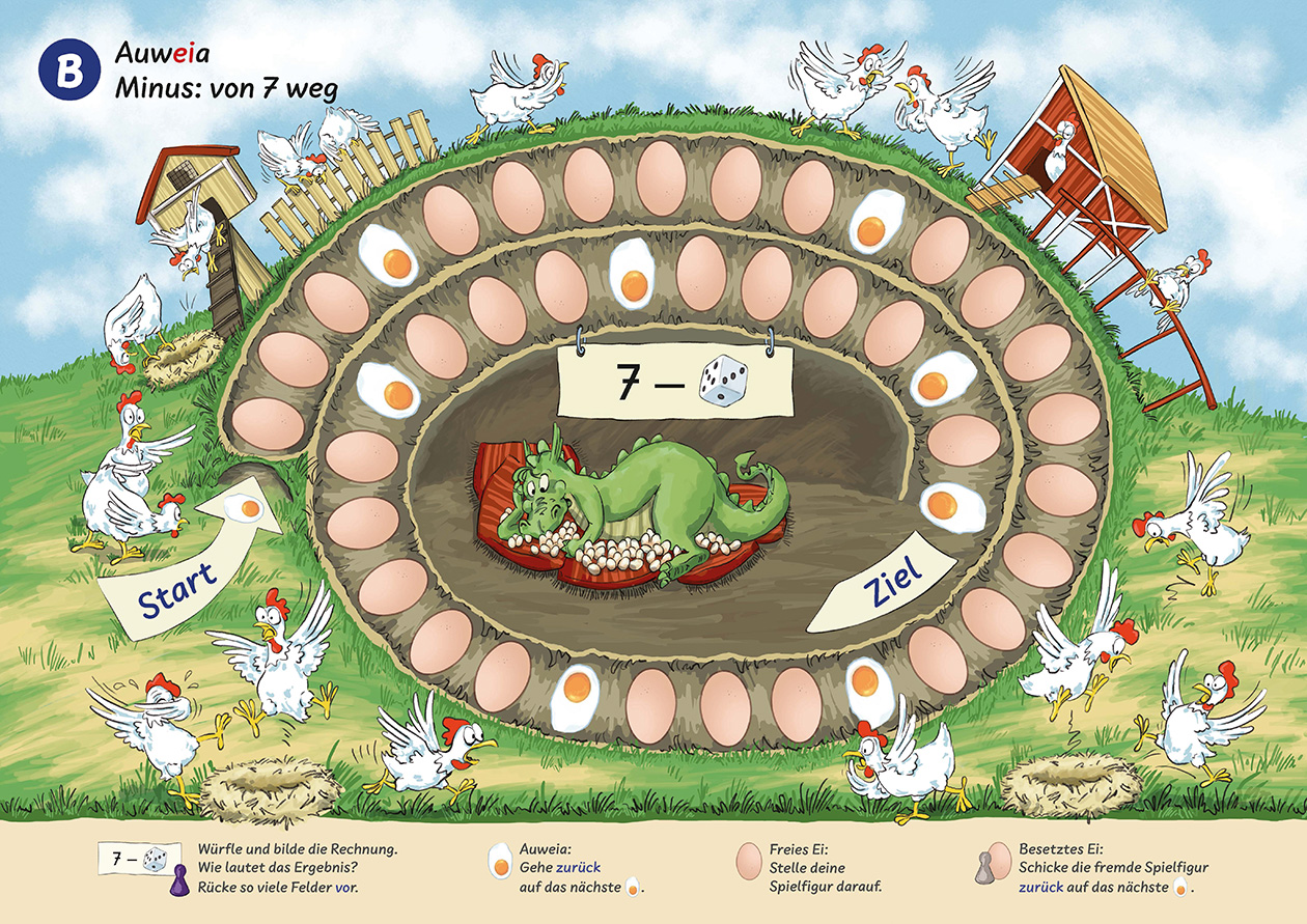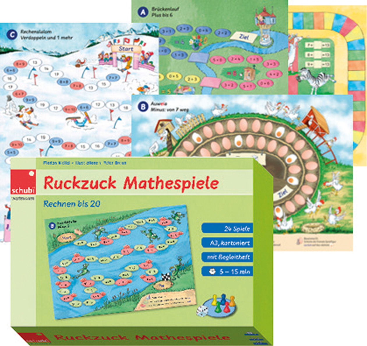 24 Lernspiele auf 12 kartonierten Spielplänen A3 in Farbe (beidseitig bedruckt), ausführliches Begleitheft, 1 Würfel, 5 Spielfiguren