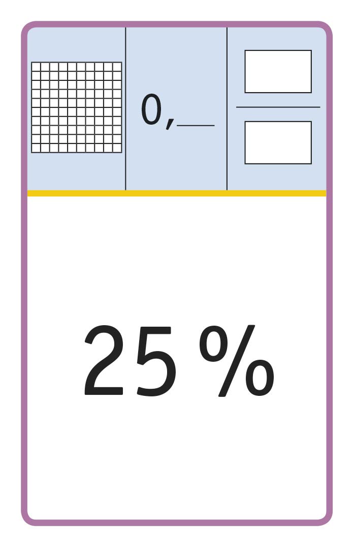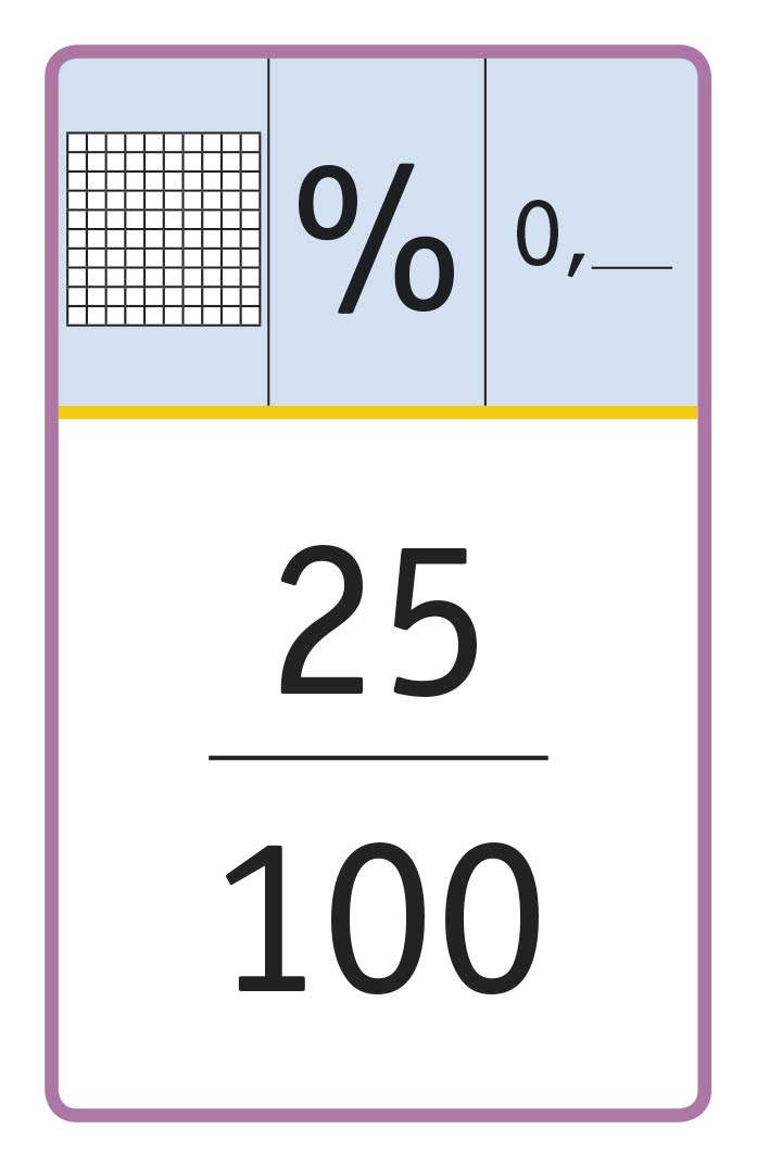 Brüche und Prozente verstehen und trainieren. Hier werden Viererreihen zu bestimmten Prozentsätzen bzw. Hunderter-Anteilen in verschiedenen Darstellungsweisen (graphisch, Bruch, Prozentzahl und Dezimalzahl) erfragt und abgelegt. So werden unterschiedliche Aspekte der Brüche und Prozentzahlen verständlich gemacht und im Spiel verinnerlicht.