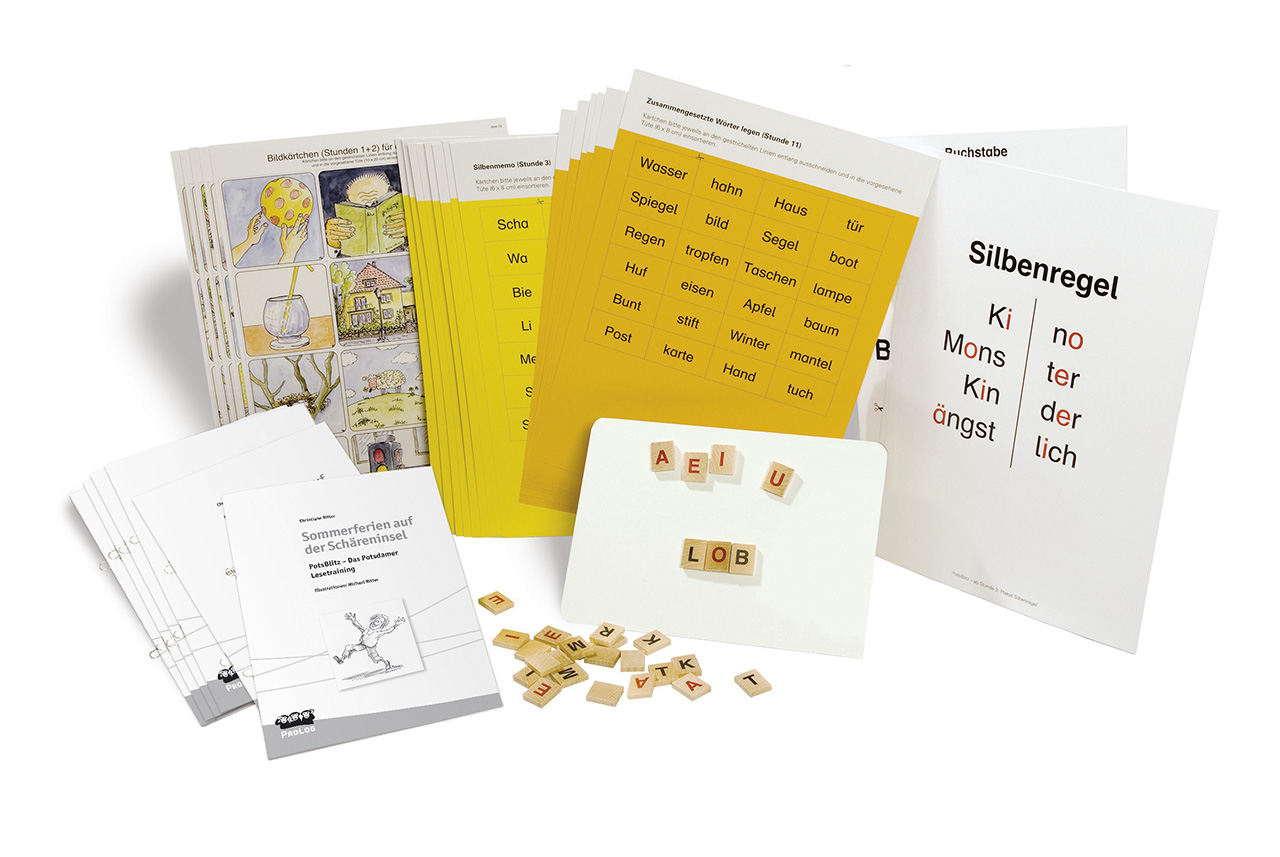 Ordner mit theoretischem Hintergrund, Hinweisen zu einem ausführlichen Lesetraining, mit 18 detaillierten Trainingseinheiten inklusive aller benötigten Arbeitsblätter und Texte, einer Buchstabentafel mit roten und schwarzen Buchstabenplättchen, einem Geschichten-Set (6 einzeln geb. Hefte), über QR-Codes abrufbares PotsBlitz-Computerprogramm zum Benennen von Blitzwörtern inklusive Wortlisten. Hinweis: Das PostBlitz-Blitzwörter-Programm läuft nicht auf Apple-Betriebssystemen.