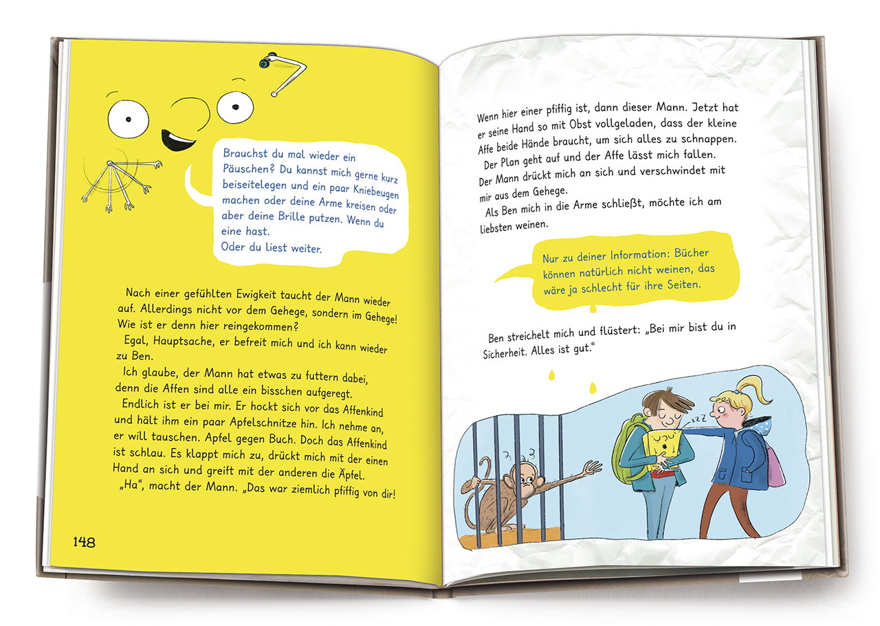 Ben und die anderen Kinder haben aber plötzlich den lustigsten Unterricht der Welt: Das Buch hilft ihnen heimlich, macht ständig Quatsch und kann fast alles. Zum Beispiel i-Punkte in Lehrernasen schießen, in der Pause auf dem Schulhof Fußball spielen und sogar die Affenkinder im Zoo austricksen. Knackt jeden Lesemuffel