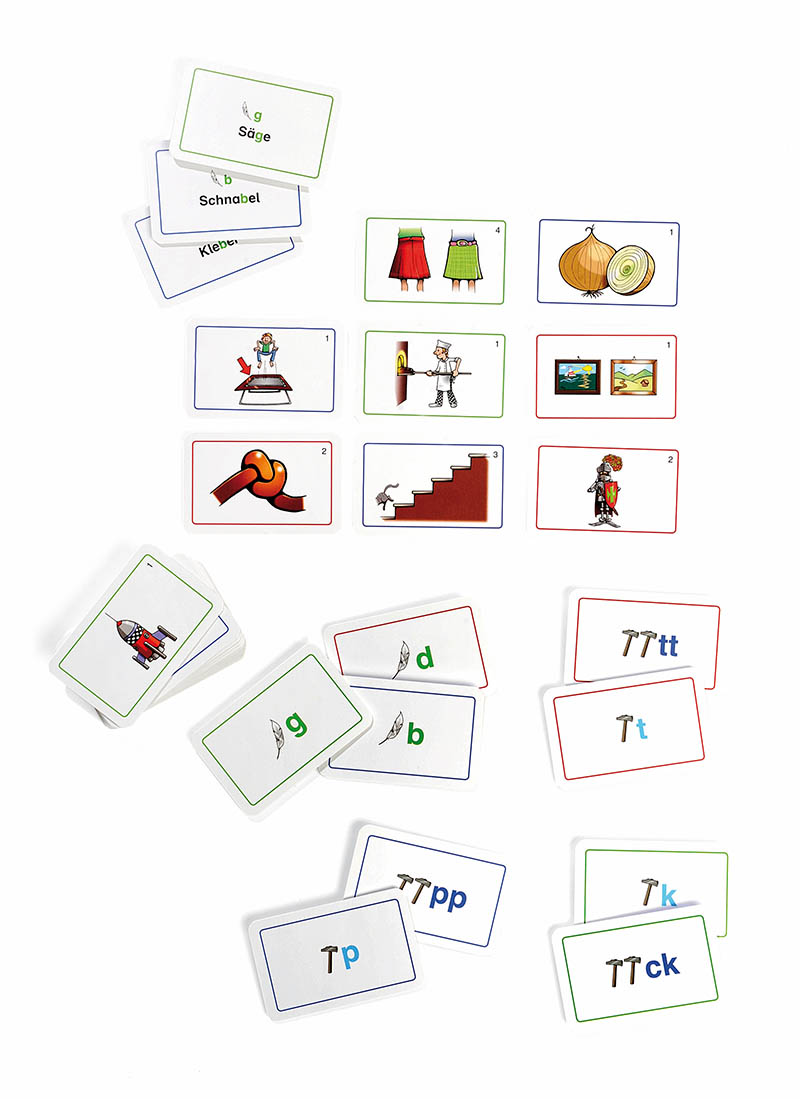 Drei Spiele mit je 48 Bild- und Lautkarten zu b - p - pp, g - k - ck und d - t - tt.
