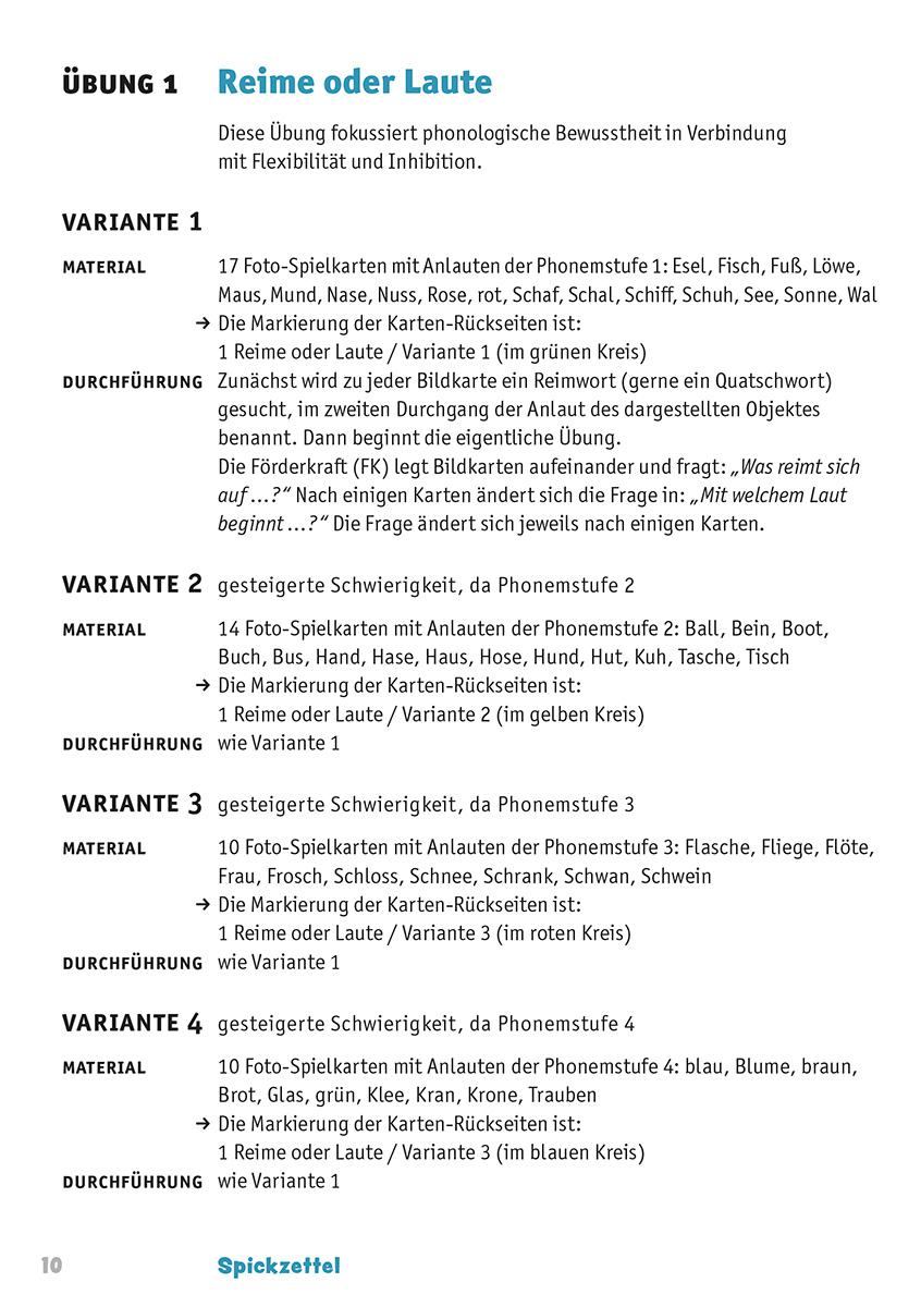 Das Begleitheft gibt einen Überblick über die einzelnen Übungen und Spiele des Moduls; es informiert darüber hinaus über wissenschaftliche und therapeutisch-praktische Hintergründe der Modulkonzeption, insbesondere auch über den in den einzelnen Übungen enthaltenen Anteil Exekutiver Funktionen. Da sich bei der Förderung Exekutiver Funktionen die Steigerung der Schwierigkeit als besonders wirksam erweist, sollen nahezu alle Übungen in unterschiedlichen Varianten (Schwierigkeitsgraden) durchgeführt werden. Somit können alle Kinder da abgeholt werden, wo sie stehen. Die Anweisungen sind trotz der Komplexität der einzelnen Spiele und Übungen klar und gut nachvollziehbar, sie erklären das Vorgehen Schritt für Schritt und ersparen so zeitaufwendige Vorbereitungen.
