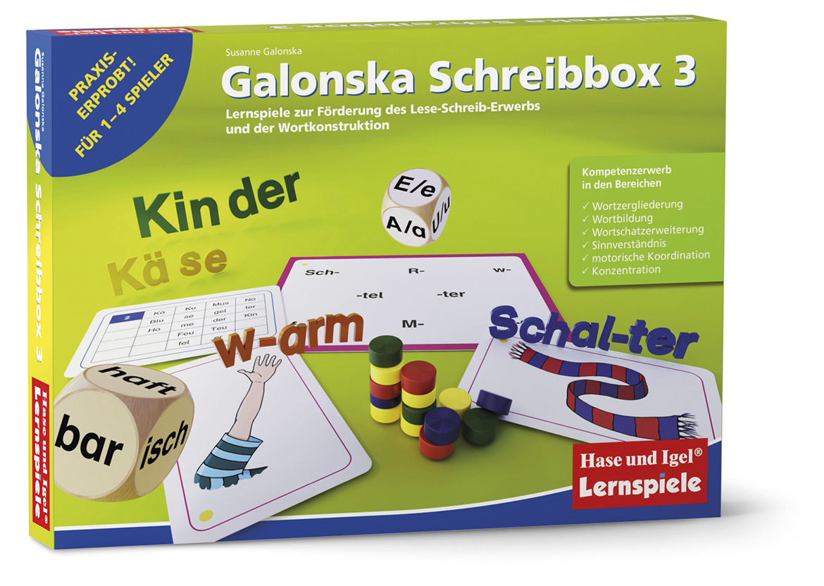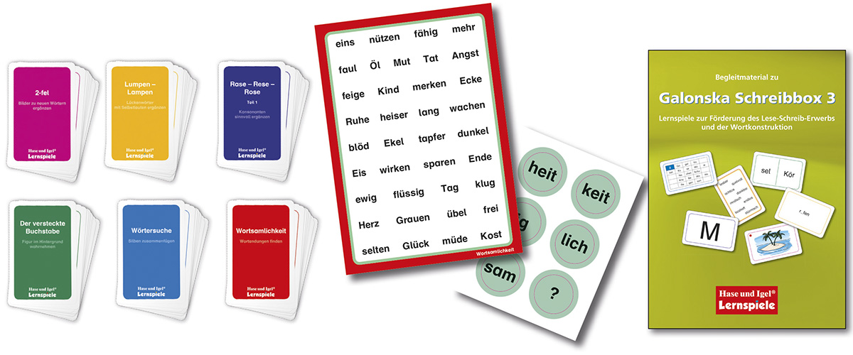 Bei den Lernspielen dieser Box geht es darum, mit Silben, Wortbausteinen und Lautergänzungen sinnvolle Wörter zu bilden. Hierfür bedarf es der Fähigkeit, Begriffe in einzelne Bestandteile und Laute zu zergliedern. Eine weitere Voraussetzung ist, zwischen bedeutungstragenden Wortteilen und Wortteilen ohne Bedeutung unterscheiden zu können.