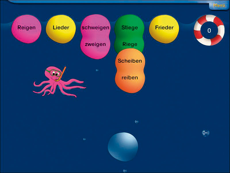 Alle relevanten orthographischen Themen in neun unabhängigen Lernspielen der Gruppen "Hören", "Rechtschreibung" und "Wortlehre". Förderung morphematischer Ableitungsstrategien, Integration erworbenen Wissens durch Wiederholung des gelernten Wortmaterials in 15 zusätzlichen Lückendiktaten.