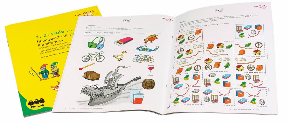 48 Seiten mit Anleitung, 15-20 Motivpaare (gesamt 140) pro Pluralmarkierung, 24 farbige Spielpläne (teilw. zum Basteln) mit Kopiervorlagen