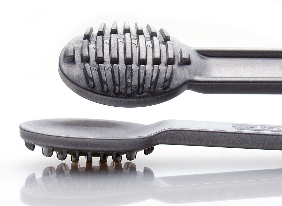 Die gerillte Textur an der Löffelunterseite ermöglicht die oral-sensorische Stimulation bei der Nahrungsaufnahme.