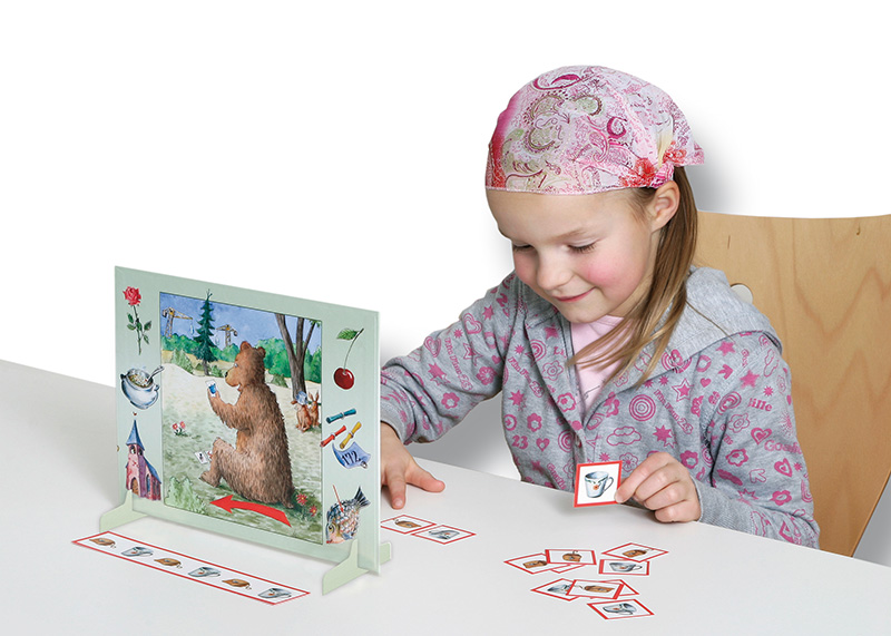 Ein effizientes Spiel zum genauen Hinhören und exakten Aussprechen problematischer Laute. Die Therapeutin benennt hinter einer Trennwand liegende Minimalpaarsequenzen auf Bilderstreifen, die das Kind mit Einzelkärtchen nachlegt. Ob die Reihenfolge stimmt, sieht man sofort beim Entfernen der Trennwand und kann so nach und nach alle Streifen gewinnen. Dann kehrt sich das Spiel um: Jetzt geht es um die korrekte Aussprache. So erwirbt das Kind spielerisch ein Bewusstsein für die korrekte Verwendung von Lauten. Minimix ist ein tolles Motivationsmittel, das auch auf Satzebene und zum Training der Hörmerkspanne eingesetzt werden kann.