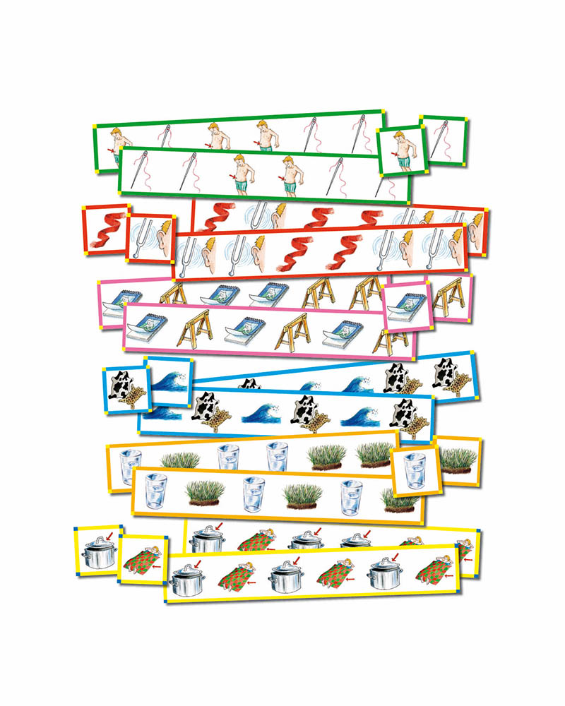 6 weitere Spiele à 20 Minimalpaaren (6 x 40 Spielkärtchenstreifen, 6 x 40 Einzelkärtchenstreifen, 6 x 20 Sortiertütchen)
