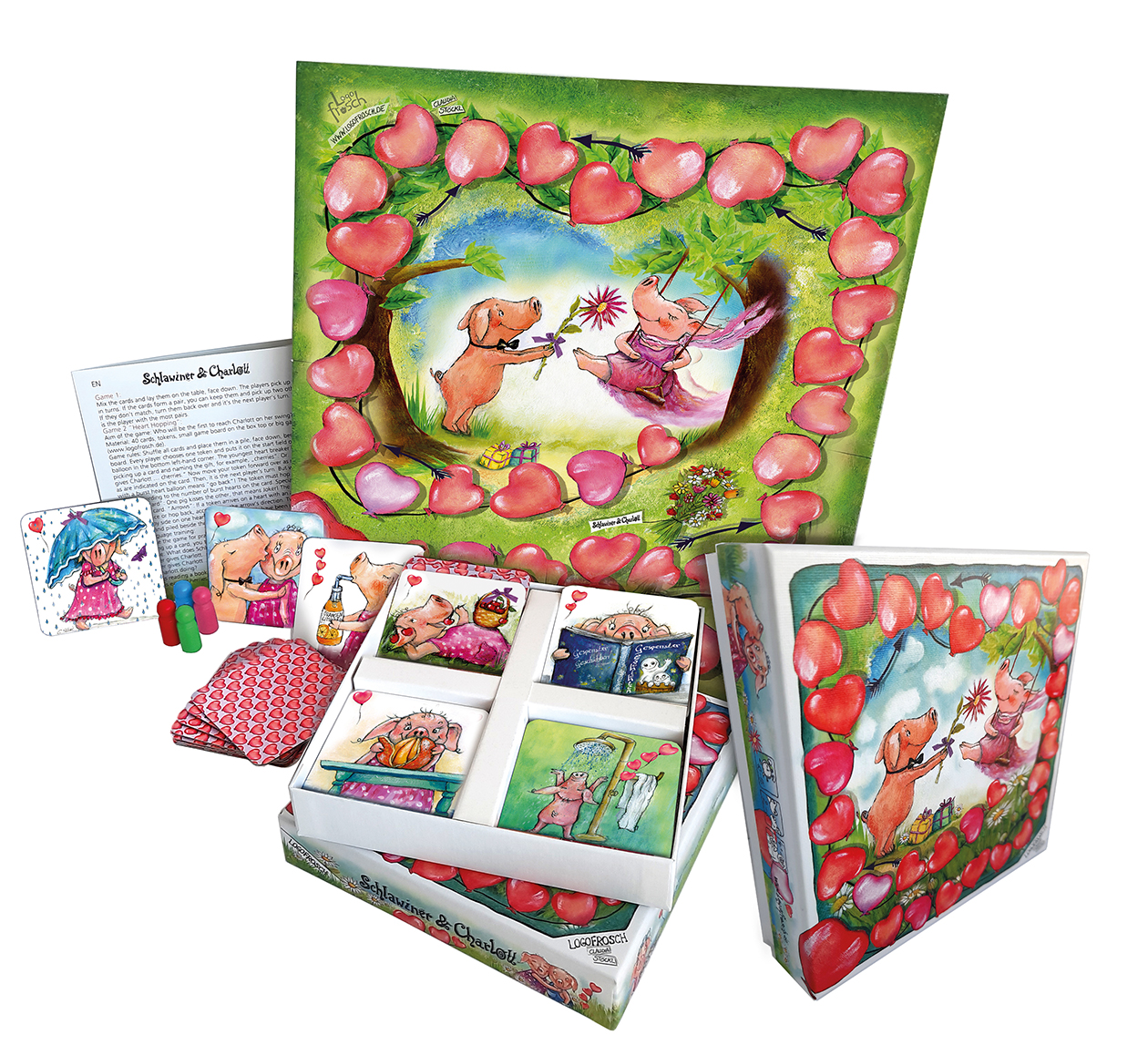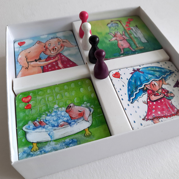 52 Memo-Karten (6 x 6 cm), 4 oder 5 Holzfiguren, klappbarem Spielbrett (26,4 x 26,4 cm), Spielanleitung in den Sprachen D, EN, FR, IT