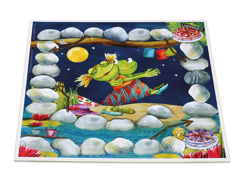 großes Würfelspiel, das vor allem für Kinder mit feinmotorischen Schwierigkeiten oder auch mit einer kleinen Gruppe sehr gut gespielt werden kann. Wer zieht die besten Karten und kommt am schnellsten über den steinigen Weg zu Toni und Tini, die bei Mondschein Tango am Teich tanzen.