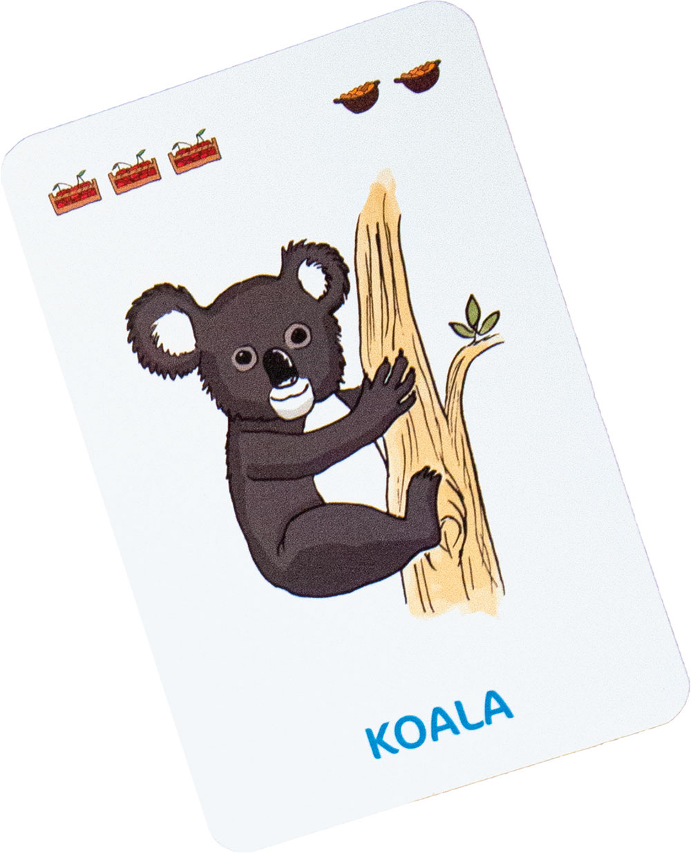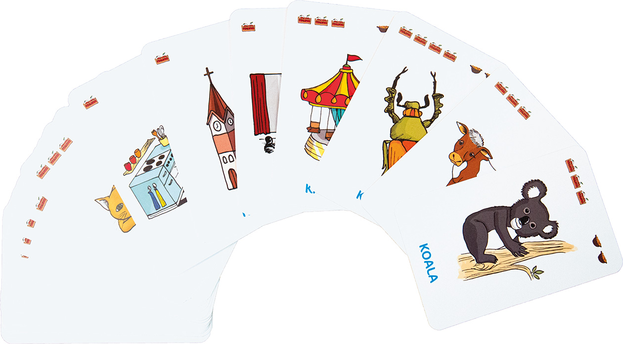 Dieses Spiel ist gut geeignet, um den Laut /K/ effektiv zu üben. Bei jeder Karte ist der Übungslaut mindestens dreimal enthalten - im Bild, im Symbol und im Inhalt des Korbes (Kirschen oder Kartoffeln) - und muss für den Fortgang des Spiels auch produziert werden. Zum Beispiel: „Ich habe das Kino und drei Körbe mit Kirschen.“ Der Mitspieler benennt darauf sein Bild und die entsprechende Anzahl der Körbe. Wer die meisten Körbe hat, gewinnt diese Runde und darf die neue Runde ansagen (Prinzip des Autokarten-Quartetts). Auch eine einfache Variante für die Wortebene ist durchaus möglich. Die Spieler sagen lediglich die Symbole an und legen dann ihre Karten auf den Tisch. Anschließend werden die Werte der entsprechenden Farbe verglichen und der Sieger wird ermittelt. Ohne viel Aufwand lässt sich das Spiel nahezu überall mit hinnehmen und ist somit sowohl für den Einsatz in der Therapie als auch zu Hause bestens geeignet. Auf die ungefähre Gleichverteilung von Anlaut, Inlaut und Auslaut und die Vermeidung von Konsonantenverbindungen wurde geachtet.