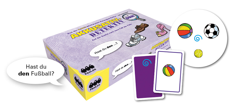 Das Spiel ermöglicht mit ausschließlich männlichen Nomen die Frageform „Hast du den…?" (z. B. Fußball, Tennisball oder Wasserball)".