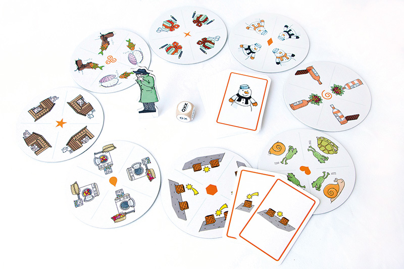 32 Einzelbildkarten, 8 Übersichtsscheiben, 20 mm-Blankowürfel mit Klebeetiketten, Spielfigur Ganove, Spielanleitung, in Schachtel