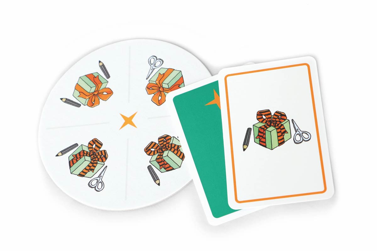 Beispielsatz: „Steht das Geschenk mit der gestreiften Schleife zwischen Stift und Schere?"