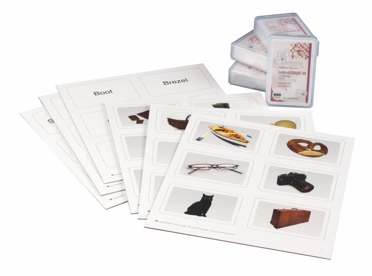 lottoKRAN® ist universell im Training zur Worterkennung, -findung und -ergänzung in den Bereichen Nomen, Nomina Komposita, Verb und Adjektiv einsetzbar. Es bildet zudem die Grundlage für strukturierte Übungseinheiten zum korrekten Satzaufbau (Subjekt, PKRANunterwegs ergänzt das KRAN-Aphasie-Material um ein weiteres Themengebiet für alle bekannten Module. Begrifflich und bildsemantisch bietet es die alltagsrelevanten Themen „Auto“ und „Reisen“ in gewohnt-hochwertiger Qualität und umfassender Struktur an. rädikat, Objekt). Der Einsatz ist für die gezielte sprachsystematische Arbeit und zum Kommunikationstraining geeignet.