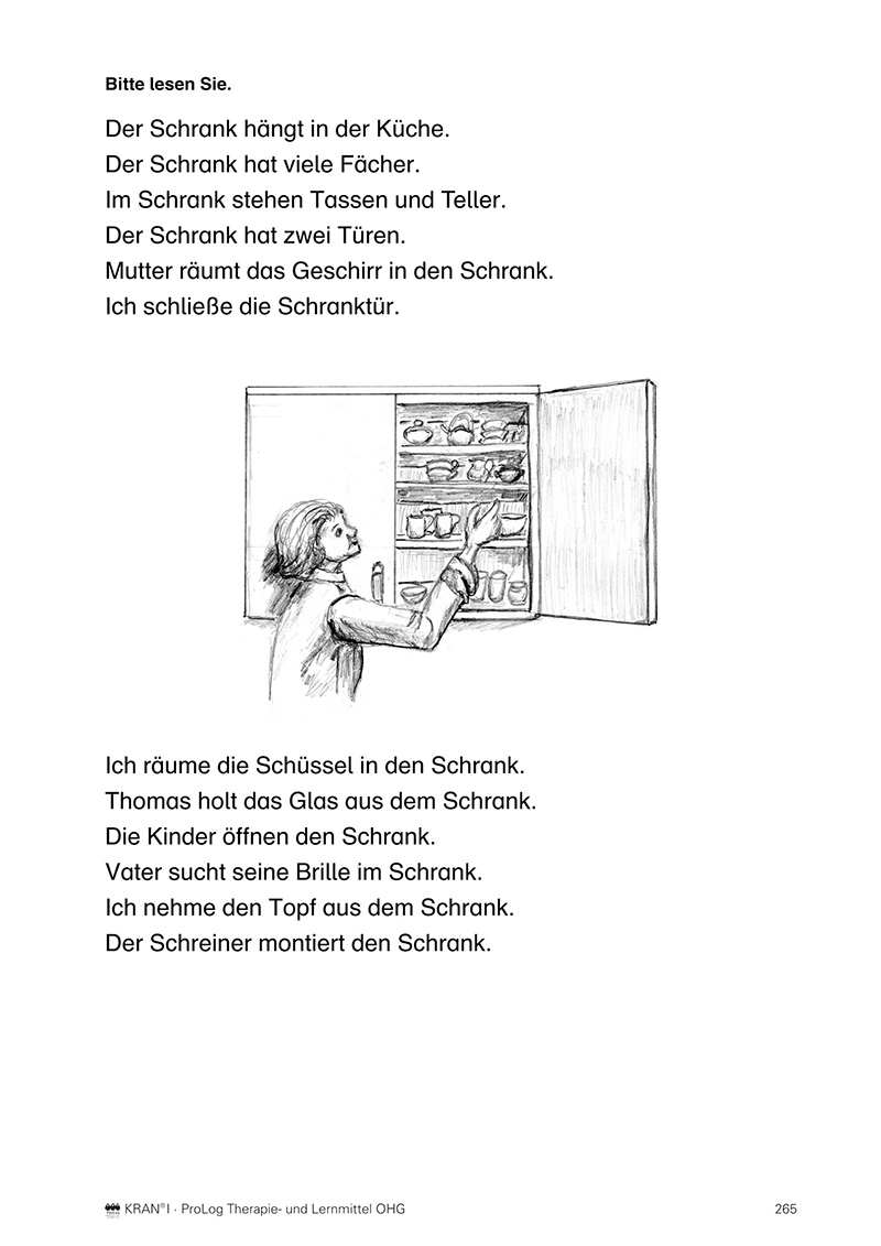 Der KRAN-Ordner beinhaltet neben dem einführenden Manual über 260 Arbeitsblätter zu den Übungsbereichen Nomen, Nomina komposita, Semantik, Verben, Sätze, Adjektive, Texte, Ortsbestimmungen, Artikel und Transfer mit vielseitigen Aufgabenstellungen. Innerhalb eines Übungsbereiches steigert sich der Schweregrad der Aufgabenstellungen, wodurch die Aufgaben an die Fähigkeiten des Patienten angepasst werden können. Das 13-seitige praxiserprobte Screening umfasst Benennleistungen, Lesesinnverständnis, Schreibleistungen und das auditive Sprachverständnis.