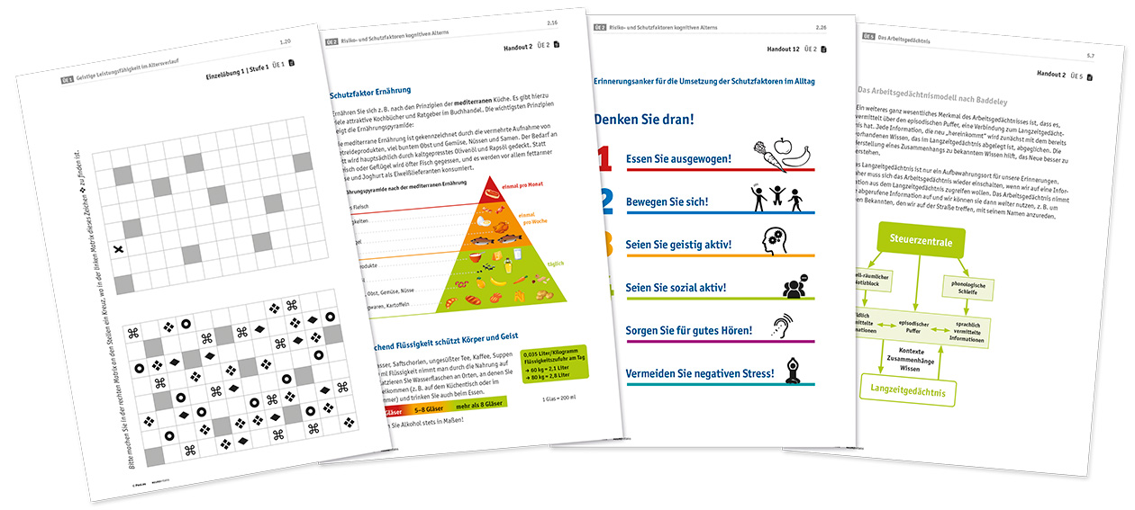 Der Basisordner richtet sich an Therapeuten und Gruppenleiter, die ein gut strukturiertes, umfassendes 12-stufiges Programm für ältere Menschen anbieten möchten, die präventiv einem altersbedingten kognitiven Leistungsabbau entgegenwirken möchten. Durch seinen zweistufigen Aufbau ist es auch für Patienten geeignet, die unter leichten kognitiven Störungen leiden und ihr geistiges Leistungsvermögen stabilisieren möchten. Für den Einsatz in Kliniken, Praxen und Senioreneinrichtungen bietet es mit seinen Durchführungsanleitungen für den Übungsleiter, den funktionsspezifischen Gruppen- und Einzelübungen und den psychoedukativen Elementen ein wirksames und abwechslungsreiches Training. Die Grafiken, Arbeitsmaterialien und Einzelübungen stehen zusätzlich auf beigefügtem Datenträger zu Präsentationszwecken und zum Ausdruck zur Verfügung. Literaturhinweise zur Vertiefung der Themen sowie zu den Wirksamkeitsstudien finden sich im Anhang.