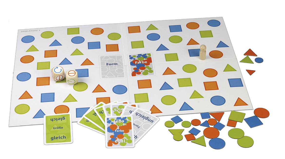 Querdenken ist ein Aktivierungsspiel zur Förderung der selektiven und geteilten Aufmerksamkeit durch die Zuordnung von Farb-, Form- und Größenkombinationen nach teils interferierenden Kriterien und wechselnden Regeln.