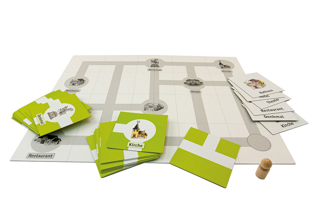 Spielesammlung mit Anleitung für NEUROvitalis sinnreich-Varianten der drei Spielformen: "Querdenken" mit 108 Spielplättchen, 4 Regelkarten mit einem Aufstellfuß, beidseitig bedruckter Spielplan; "Stadtplan-Spiel" mit 20 großen Wege- und 6 Aufdeckkarten, Spielplan, Fragenkatalog, großer Holz-Spielfigur; "Kategorien-Merkspiel" mit 96 großen Memo-Karten mit je 48 Bild- und Schriftkarten
