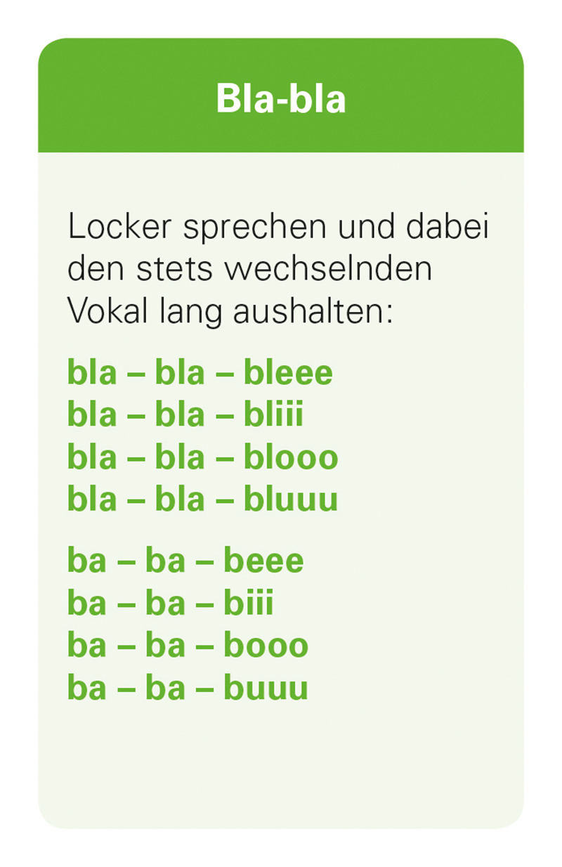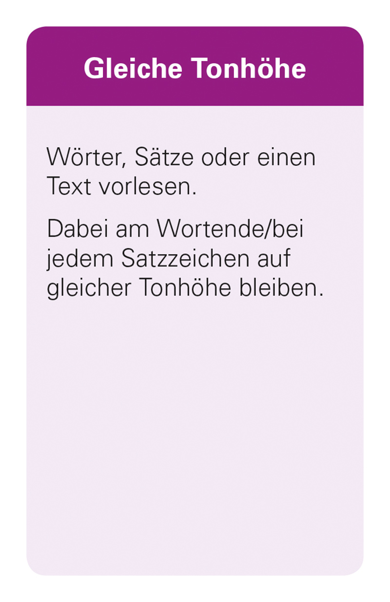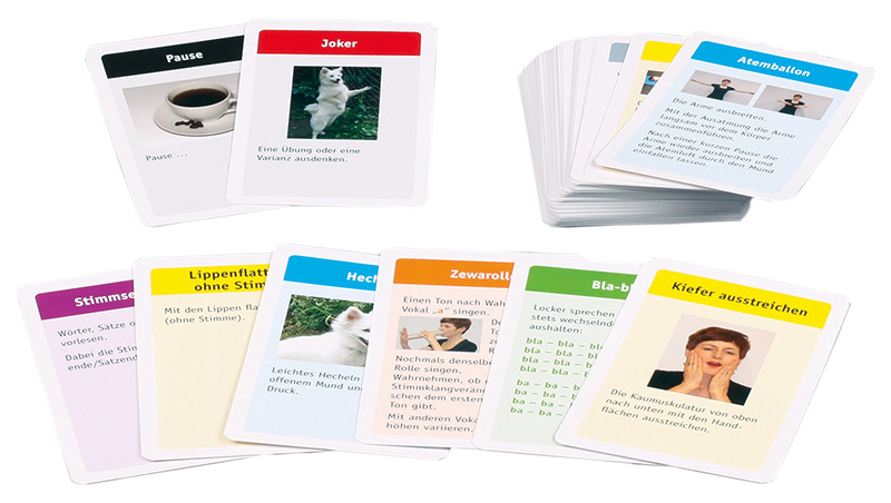 72 Karten mit 48 Übungen zu den Bereichen Lockerung und Haltung, Atmung, Phonation, Artikulation und Prosodie, Manual (24 Seiten)