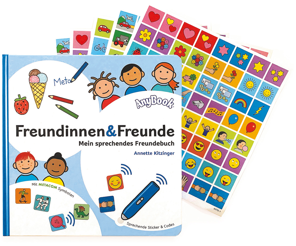 96 Seiten, Hardcover, 4-farbig, Anybook-Audiocodes für eigene Aufnahmen, 8 Bögen à 64 Sticker mit METACOM-Symbolen, in hochwertiger Box. Hinweis: Kombinierbar mit dem Anybook (Art.-Nrn. 262650)
